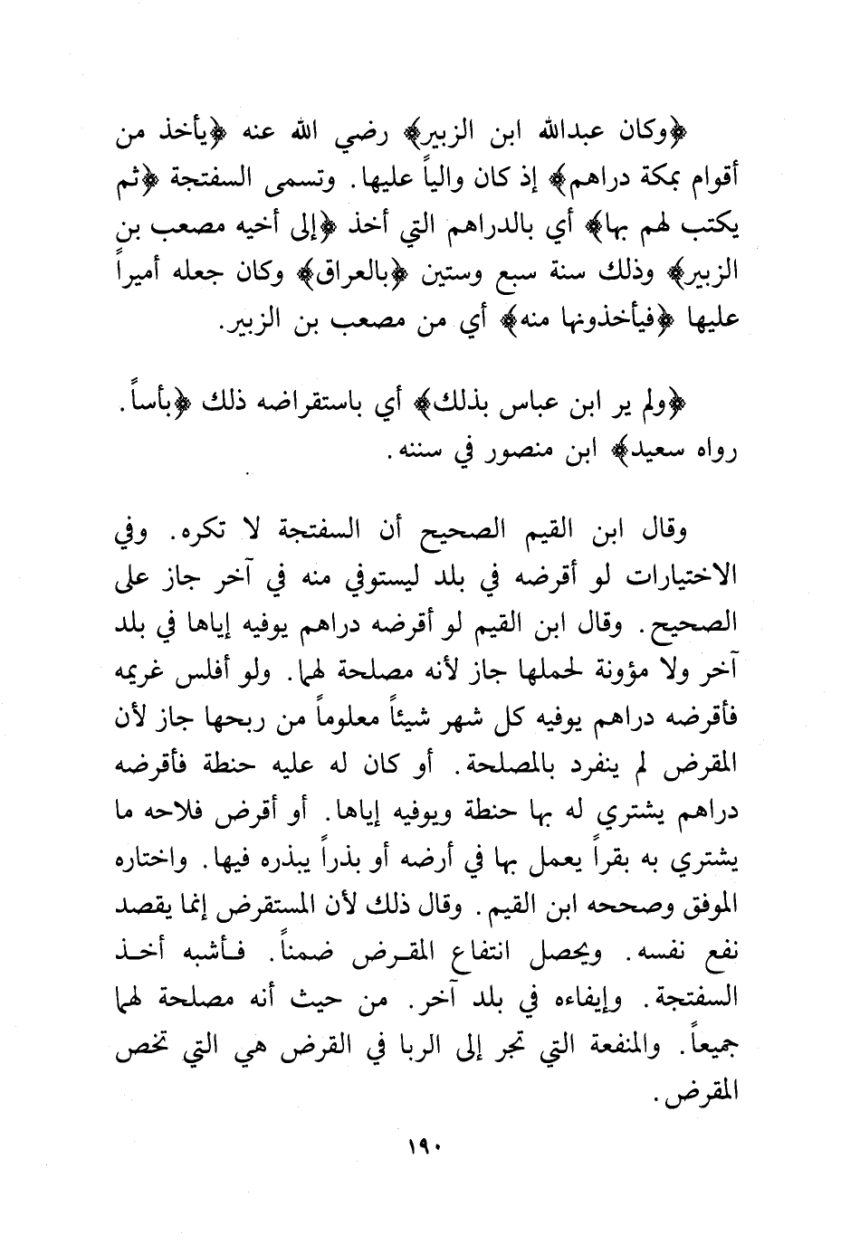 وقال ابن القيم الصحيح أن السفتجة لا تكره. وفي الاختيارات لو أقرضه في بلد ليستوفي منه في آخر جاز على الصحيح. وقال ابن القيم لو أقرضه دراهم يوفيه إياها في بلد آخر ولا مؤونة لحملها جاز لأنه مصلحة لهما. ولو أفلس غريمه فأقرضه دراهم يوفيه كل شهر شيئًا معلومًا من ربحها جاز لأن المقرض لم ينفرد بالمصلحة. أو كان له عليه حنطة فأقرضه دراهم يشتري له بها حنطة ويوفيه إياها. أو أقرض فلاحه ما يشتري به بقرًا يعمل بها في أرضه أو بذرًا يبذره فيها. واختاره الموفق وصححه ابن القيم. وقال ذلك لأن المستقرض إنما يقصد نفع نفسه. ويحصل انتفاع المقرض ضمنًا. فأشبه أخذ السفتجة. وإيفاءه في بلد آخر. من حيث إنه مصلحة لهما جميعًا. والمنفعة التي تجر إلى الربا في القرض هي التي تخص المقرض.