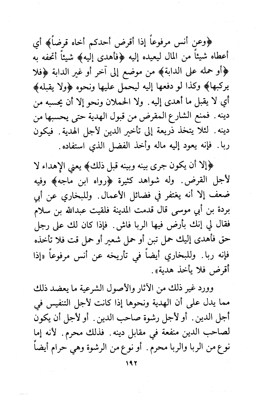 وورد غير ذلك من الآثار والأصول الشرعية ما يعضد ذلك مما يدل على أن الهدية ونحوها إذا كانت لأجل التنفيس في أجل الدين. أو لأجل رشوة صاحب الدين. أو لأجل أن يكون لصاحب الدين منفعة في مقابل دينه. فذلك محرم. لأنه إما نوع من الربا والربا محرم. أو نوع من الرشوة وهي حرام أيضًا