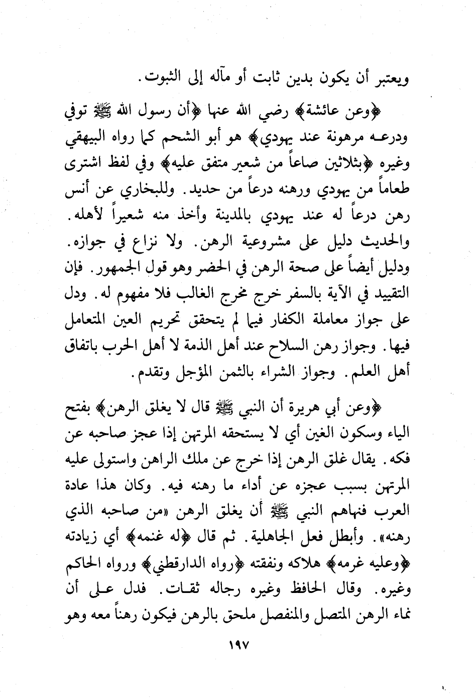 (وعن عائشة) رضي الله عنها (أن رسول الله - صلى الله عليه وسلم - توفي ودرعه مرهونة عند يهودي) هو أبو الشحم كما رواه البيهقي وغيره (بثلاثين صاعًا من شعير متفق عليه) وفي لفظ اشترى طعامًا من يهودي ورهنه درعًا من حديد. وللبخاري عن أنس رهن درعًا له عند يهودي بالمدينة وأخذ منه شعيرًا لأهله. والحديث دليل على مشروعية الرهن. ولا نزاع في جوازه. ودليل أيضًا على صحة الرهن في الحضر وهو قول الجمهور. فإن التقييد في الآية بالسفر خرج مخرج الغالب فلا مفهوم له. ودل على جواز معاملة الكفار فيما لم يتحقق تحريم العين المتعامل فيها. وجواز رهن السلاح عند أهل الذمة لا أهل الحرب باتفاق أهل العلم. وجواز الشراء بالثمن المؤجل وتقدم.