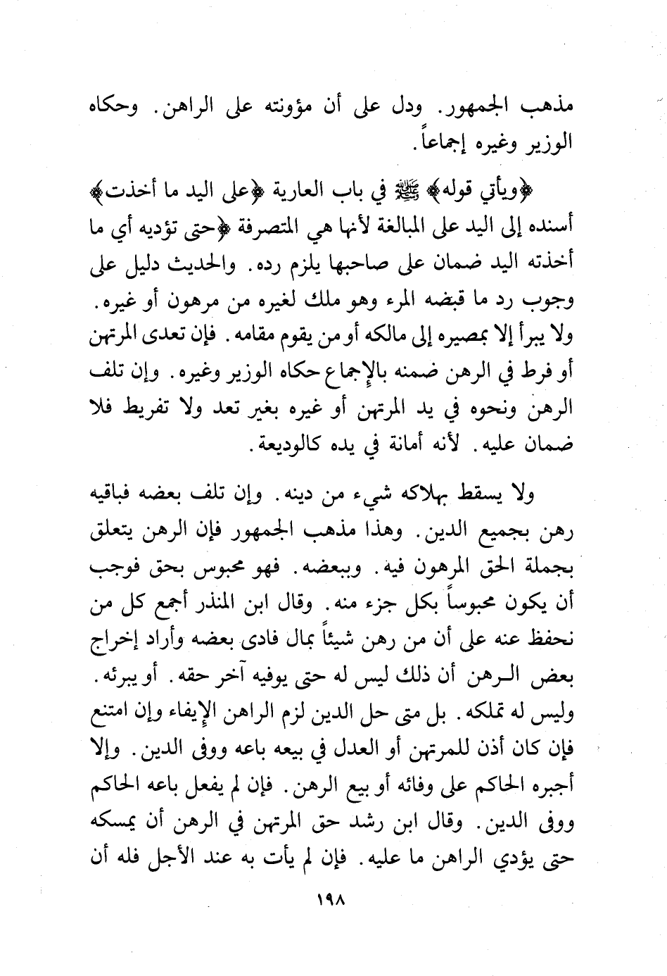 (ويأتي قوله) - صلى الله عليه وسلم - في باب العارية (على اليد ما أخذت) أسنده إلى اليد على المبالغة لأنها هي المتصرفة (حتى تؤديه أي ما أخذته اليد ضمان على صاحبها يلزم رده. والحديث دليل على وجوب رد ما قبضه المرء وهو ملك لغيره من مرهون أو غيره). ولا يبرأ إلا بمصيره إلى مالكه أو من يقوم مقامه. فإن تعدي المرتهن أو فرط في الرهن ضمنه بالإجماع حكاه الوزير وغيره. وإن تلف الرهن ونحوه في يد المرتهن أو غيره بغير تعدٍ ولا تفريط فلا ضمان عليه. لأنه أمانة في يده كالوديعة.