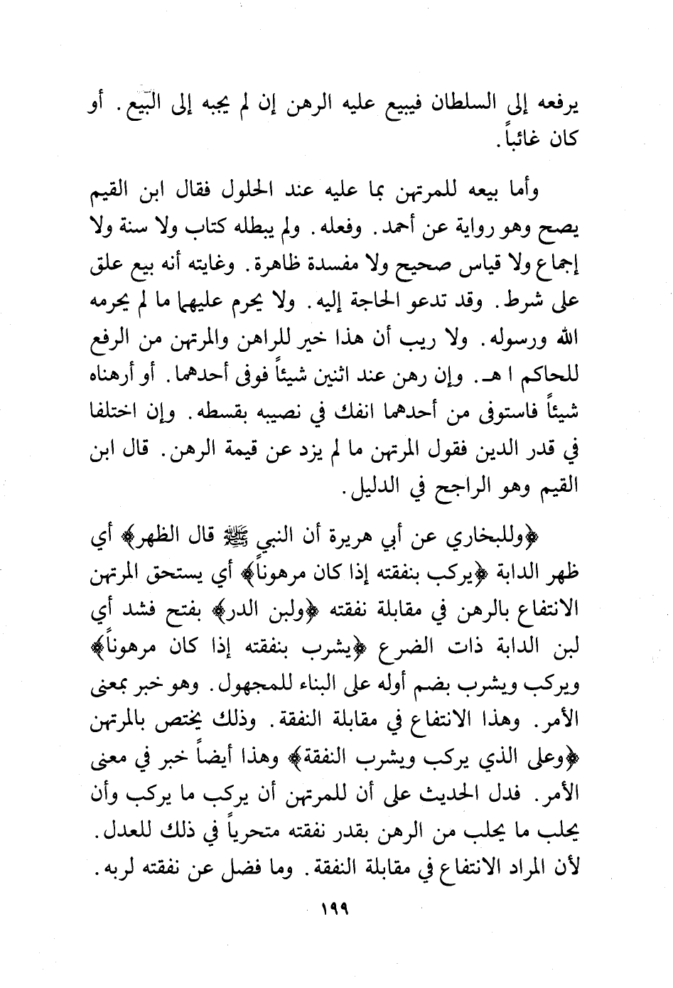 (وللبخاري عن أبي هريرة أن النبي -صلى الله على وسلم- قال الظهر) أي ظهر الدابة (يُركب بنفقته إذا كان مرهونًا) أي يستحق المرتهن الانتفاع بالرهن في مقابلة نفقته (ولبن الدَرّ) بفتح فشد أي لبن الدابة ذات الضرع (يشرب بنفقته إذا كان مرهونًا) ويُركب ويُشرب بضم أوله على البناء للمجهول. وهو خبر بمعنى الأمر. وهذا الانتفاع في مقابلة النفقة. وذلك يختص بالمرتهن (وعلى الذي يركب ويشرب النفقة) وهذا أيضًا خبر في معنى الأمر. فدل الحديث
