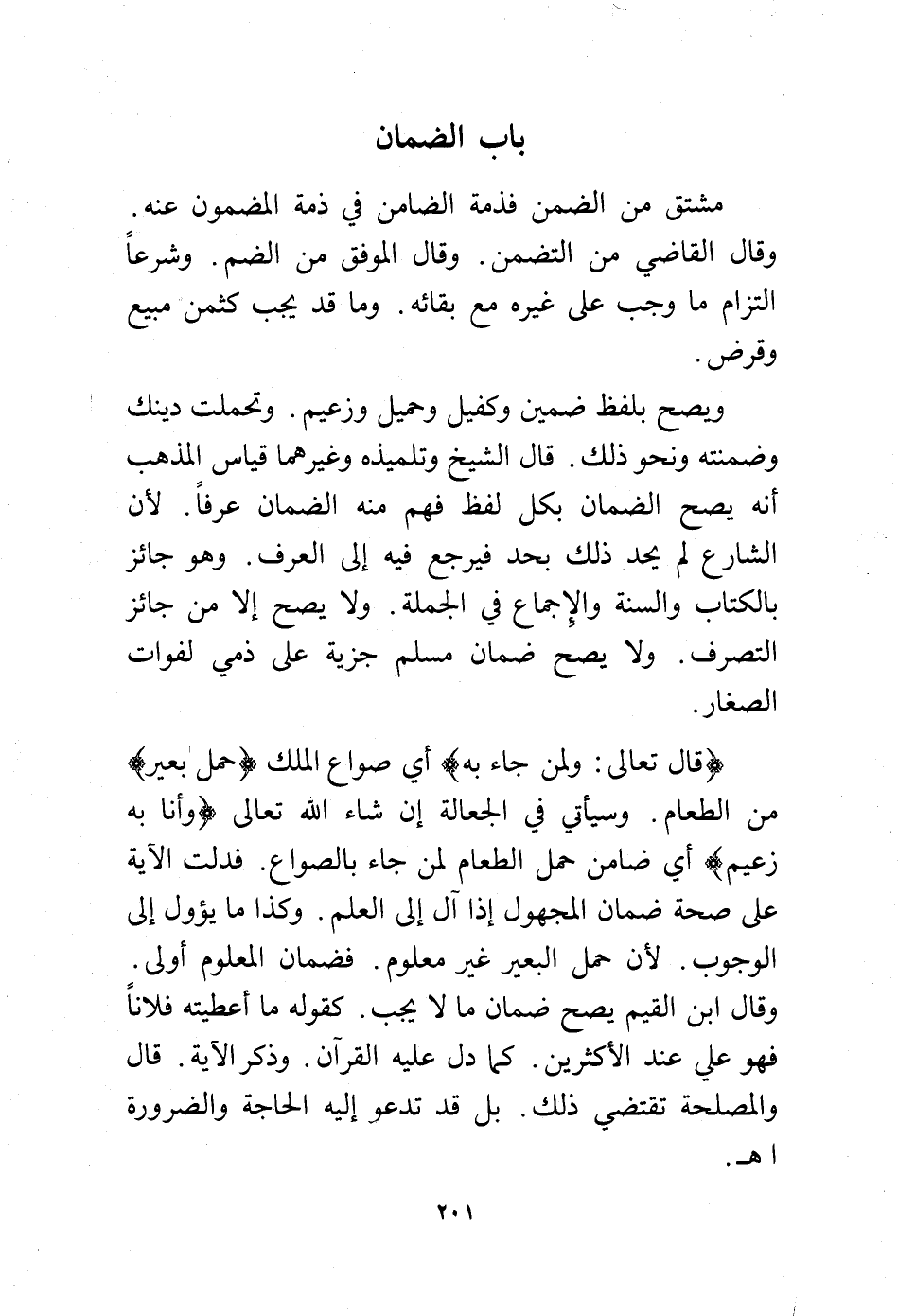 (قال تعالى: {وَلِمَن جَاء بِهِ}) أي صواع الملك ({حِمْلُ بَعِيرٍ}) من الطعام. وسيأتي في الجعالة إن شاء الله تعالى {وَأَنَاْ بِهِ زَعِيم} أي ضامن حمل الطعام لمن جاء بالصواع. فدلت الآية على صحة ضمان المجهول إذا آل إلى العلم. وكذا ما يؤول إلى الوجوب. لأن حمل البعير غير معلوم. فضمان المعلوم أولى.