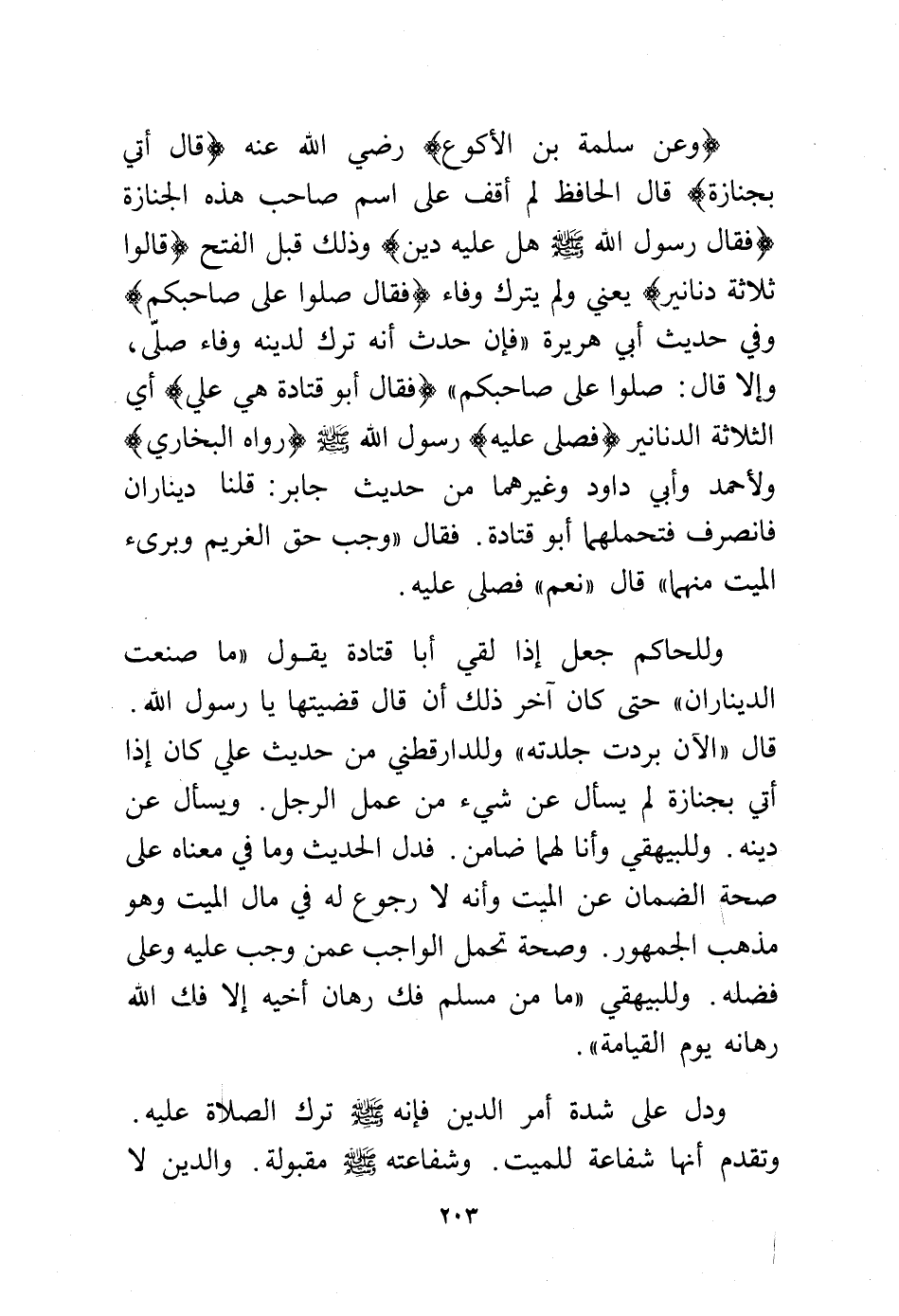(وعن سلمة بن الأكوع) -رضي الله عنه- (قال أُتي بجنازة) قال الحافظ لم أقف على اسم صاحب هذه الجنازة (فقال رسول الله - صلى الله عليه وسلم - هل عليه دين؟) وذلك قبل الفتح (قالوا: ثلاثة دنانير) يعني ولم يترك وفاء (فقال صلوا على صاحبكم) وفي حديث أبي هريرة "فإن حدث أنه ترك لدينه وفاء صلى، وإلا قال: صلوا على صاحبكم" (فقال أبو قتادة هي عليَّ) أي الثلاثة الدنانير (فصلى عليه) رسول الله - صلى الله عليه وسلم - (رواه البخاري) ولأحمد وأبي داود وغيرهما من حديث جابر: قلنا ديناران فانصرف فتحملهما أبو قتادة. فقال "وجب حق الغريم وبرئ الميت منهما" قال "نعم" فصلى عليه.