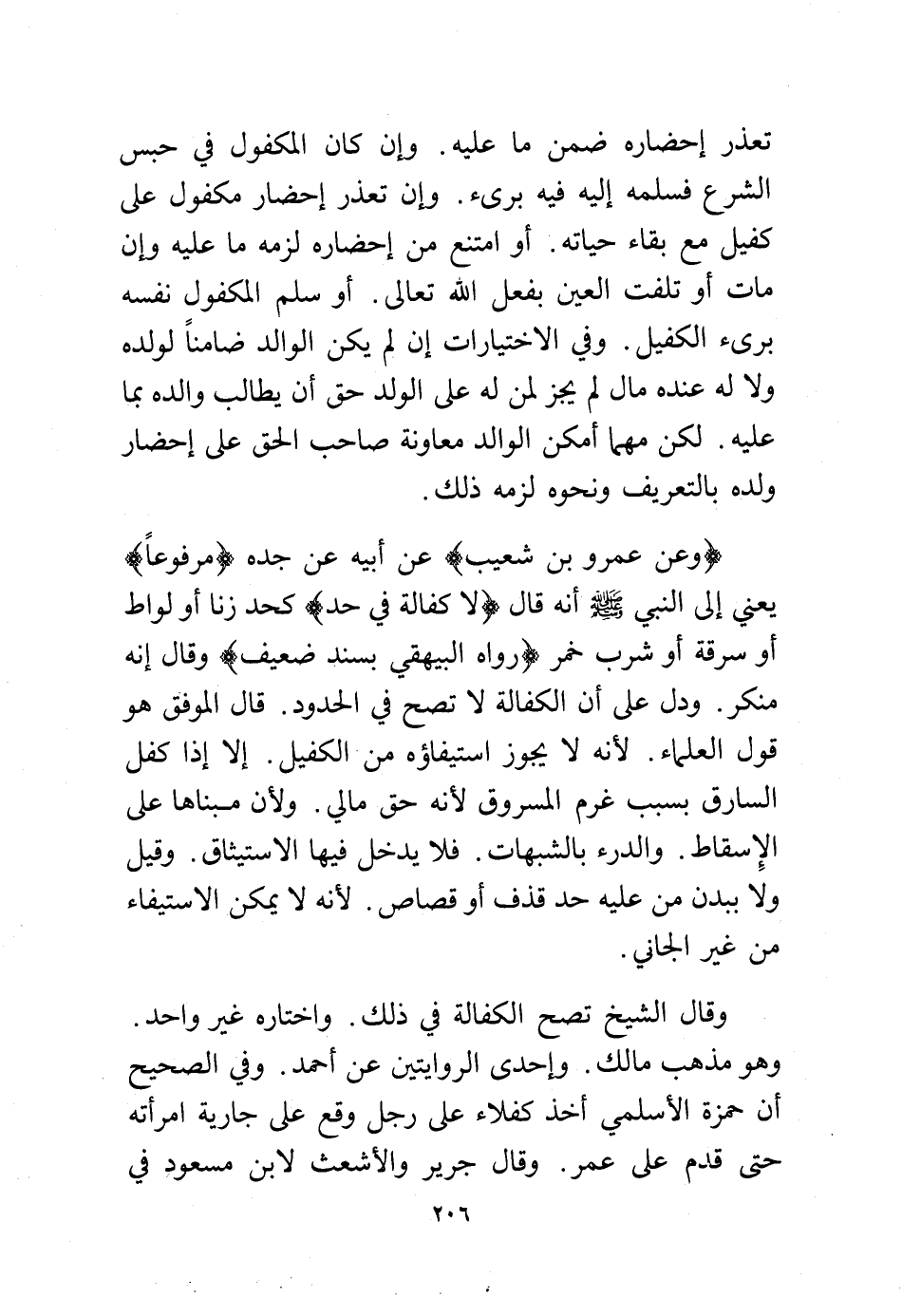 وقال الشيخ تصح الكفالة في ذلك. واختاره غير واحد. وهو مذهب مالك. وإحدى الروايتين عن أحمد. وفي الصحيح أن حمزة الأسلمي أخذ كفلاء على رجل وقع على جارية امرأته حتى قدم على عمر. وقال جرير والأشعث لابن مسعود في