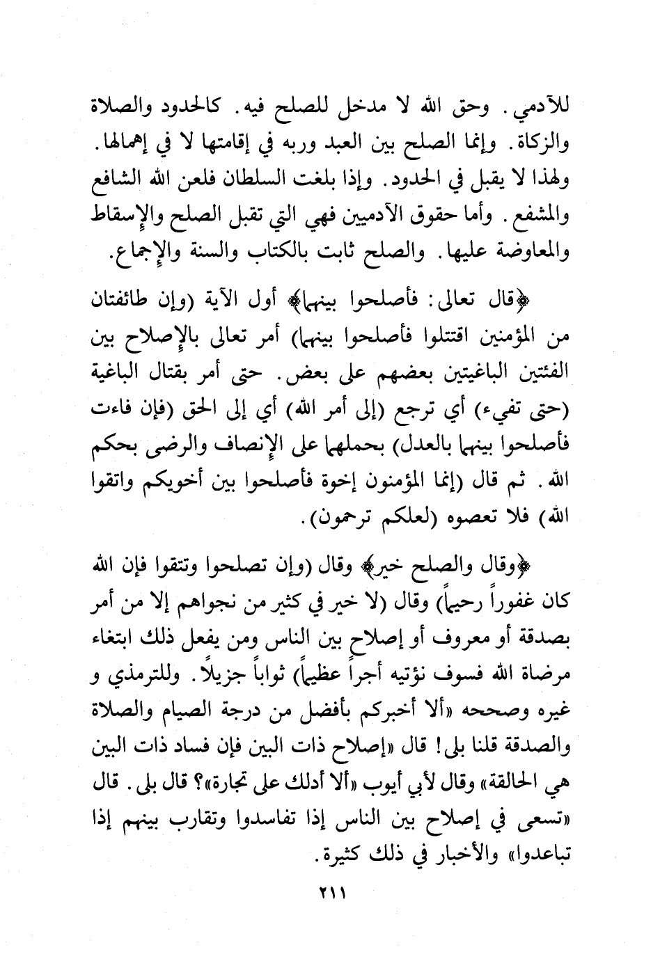 وقال: {وَالصُّلْحُ خَيْرٌ} وقال {وَإِن تُصْلِحُواْ وَتَتَّقُواْ فَإِنَّ اللهَ كَانَ غَفُورًا رَّحِيمًا} وقال: {لاَّ خَيْرَ فِي كَثِيرٍ مِّن نَّجْوَاهُمْ إِلاَّ مَنْ أَمَرَ بِصَدَقَةٍ أَوْ مَعْرُوفٍ أَوْ إِصْلاَحٍ بَيْنَ النَّاسِ وَمَن يَفْعَلْ ذَلِكَ ابْتَغَاء مَرْضَاتِ اللهِ فَسَوْفَ نُؤْتِيهِ أَجْرًا عَظِيمًا} ثوابًا جزيلًا. وللترمذي وغيره وصححه "ألا أخبركم بأفضل من درجة الصيام والصلاة والصدقة قلنا بلى! قال "إصلاح ذات البين فإن فساد ذات البين هي الحالقة" وقال لأبي أيوب "ألا أدلك على تجارة"؟ قال بلى. قال "تسعى في إصلاح بين الناس إذا تفاسدوا وتقارب بينهم إذا تباعدوا" والأخبار في ذلك كثيرة.