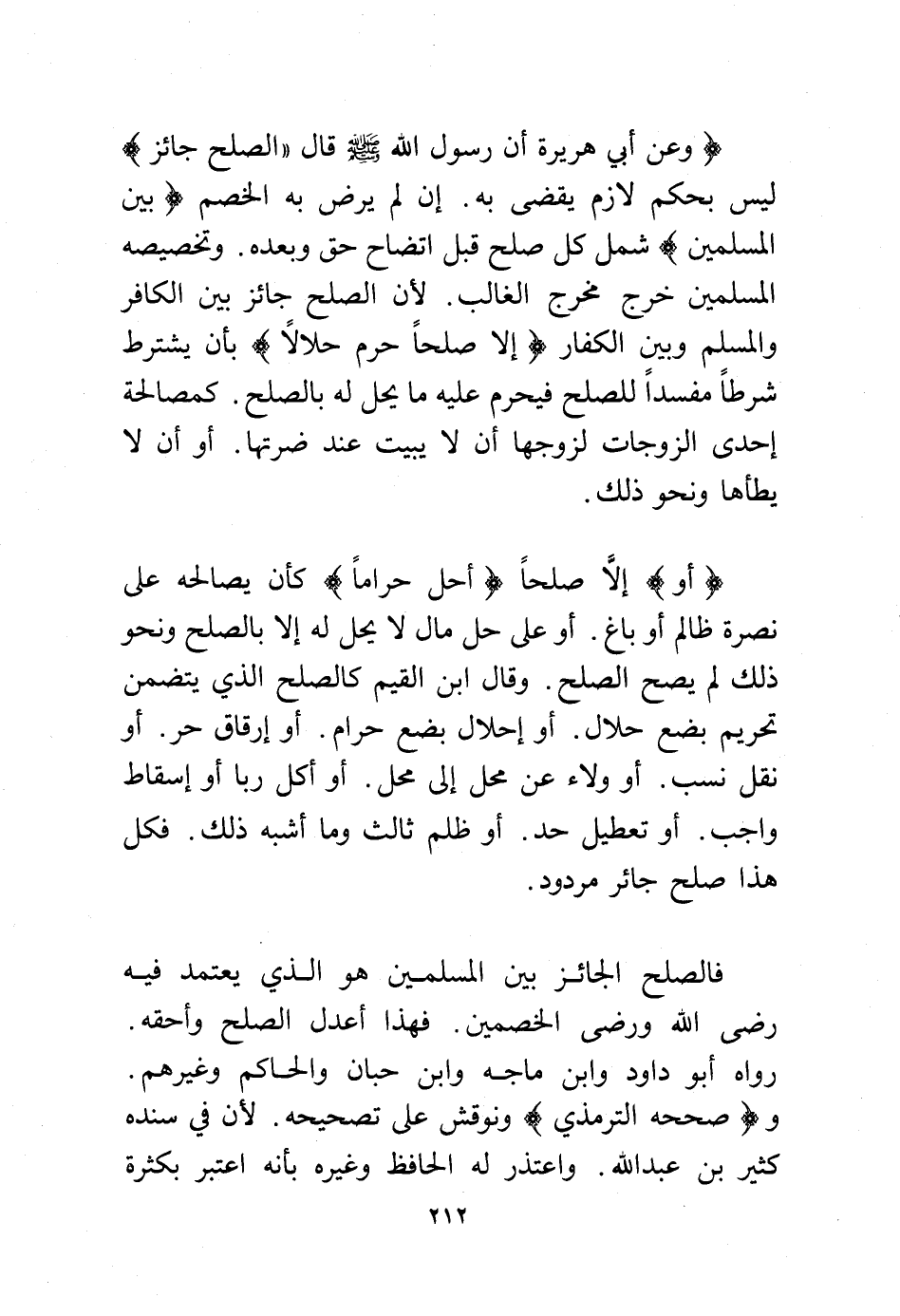 (وعن أبي هريرة أن رسول الله - صلى الله عليه وسلم - قال "الصلح جائز" ليس بحكم لازم يقضي به. إن لم يرض به الخصم (بين المسلمين) شمل كل صلح قبل اتضاح حق وبعده. وتخصيصه المسلمين خرج مخرج الغالب. لأن الصلح جائز بين الكافر والمسلم وبين الكفار (إلا صلحًا حرم حلالاً) بأن يشترط شرطًا مفسدًا للصلح فيحرم عليه ما يحل له بالصلح. كمصالحة إحدى الزوجات لزوجها أن لا يبيت عند ضرتها. أو أن لا يطأها ونحو ذلك.