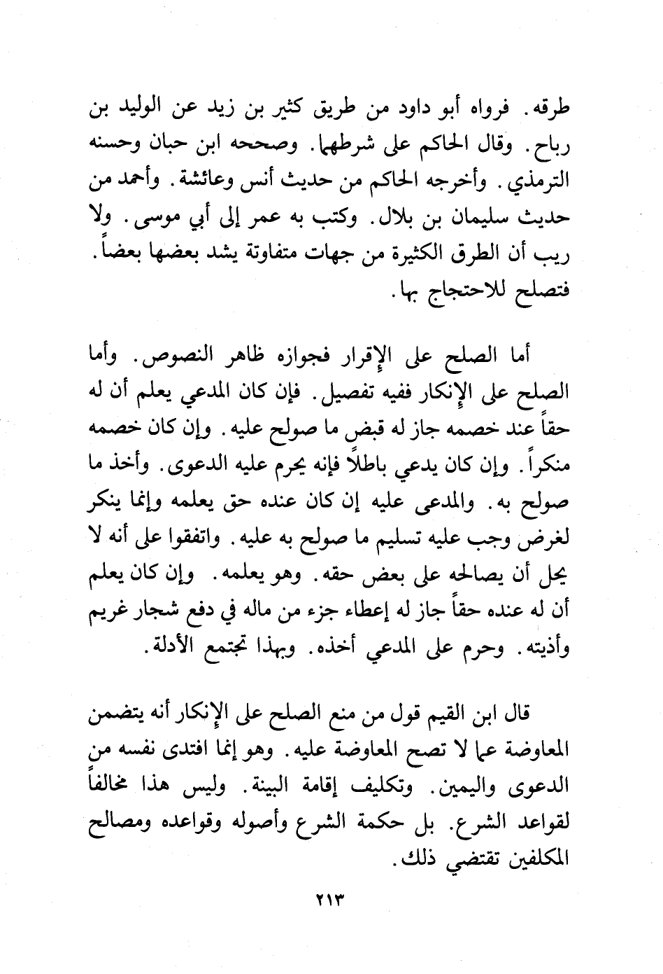 قال ابن القيم قول من منع الصلح على الإنكار أنه يتضمن المعاوضة عما لا تصح المعاوضة عليه. وهو إنما افتدى نفسه من الدعوى واليمن. وتكليف إقامة البينة. وليس هذا مخالفًا لقواعد الشرع. بل حكمة الشرع وأصوله وقواعده ومصالح المكلفين تقتضي ذلك.