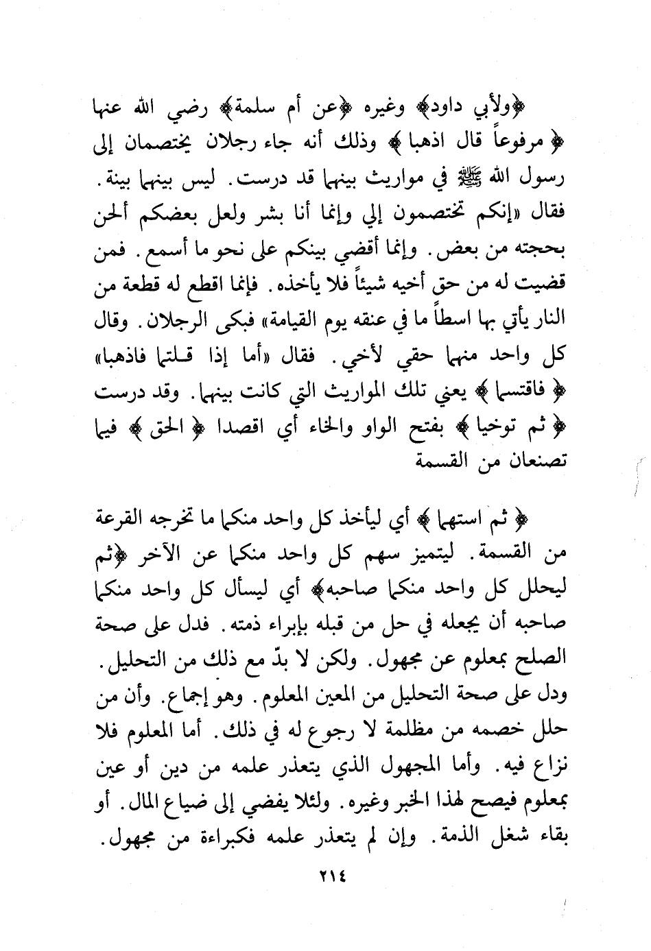 (ولأبي داود) وغيره (عن أم سلمة) رضي الله عنها (مرفوعًا قال اذهبا) وذلك أنه جاء رجلان يختصمان إلى رسول الله - صلى الله عليه وسلم - في مواريث بينهما قد درست. ليس بينهما بينة فقال "إنكم تختصمون إليَّ وإنما أنا بشر ولعل بعضكم ألحن بحجته من بعض. وإنما أقضي بينكم على نحو ما أسمع. فمن قضيت له من حق أخيه شيئًا فلا يأخذه. فإنما أقطع له قطعة من النار يأتي بها اسطامًا في عنقه يوم القيامة" فبكى الرجلان. وقال كل واحد منهما حقي لأخي. فقال "أما إذا قلتما فاذهبا" (فاقتسما) يعني تلك المواريث التي كانت بينهما. وقد درست (ثم توَخَيا) بفتح الواو والخاء أي اقصدا (الحق) فيما تصنعان من القسمة.
