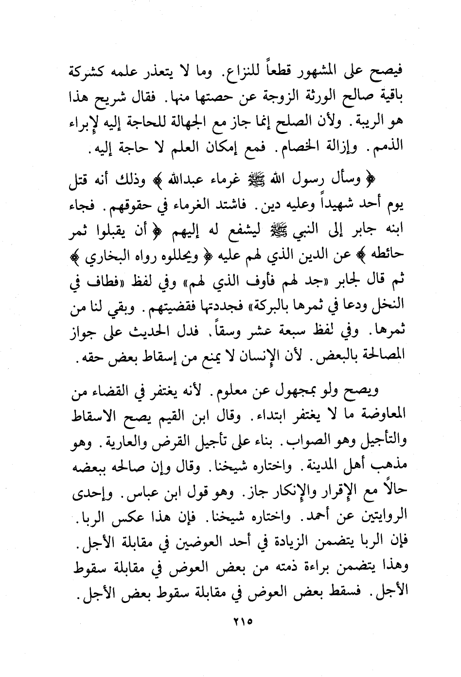(وسأل رسول الله - صلى الله عليه وسلم - غرماء عبد الله) وذلك أنه قتل يوم أحد شهيدًا وعليه دين. فاشتد الغرماء في حقوقهم. فجاء ابنه جابر إلى النبي - صلى الله عليه وسلم - ليشفع له إليهم (أن يقبلوا ثمر حائطه) عن الدين الذي لهم عليه (ويحللوه رواه البخاري) ثم قال لجابر "جد لهم فأوف الذي لهم" وفي لفظ "فطاف في النخل ودعا في ثمرها بالبركة" فجددتها فقضيتهم. وبقي لنا من ثمرها. وفي لفظ سبعة عشر وسقًا. فدل الحديث على جواز المصالحة بالبعض. لأن الإنسان لا يمنع من إسقاط بعض حقه.