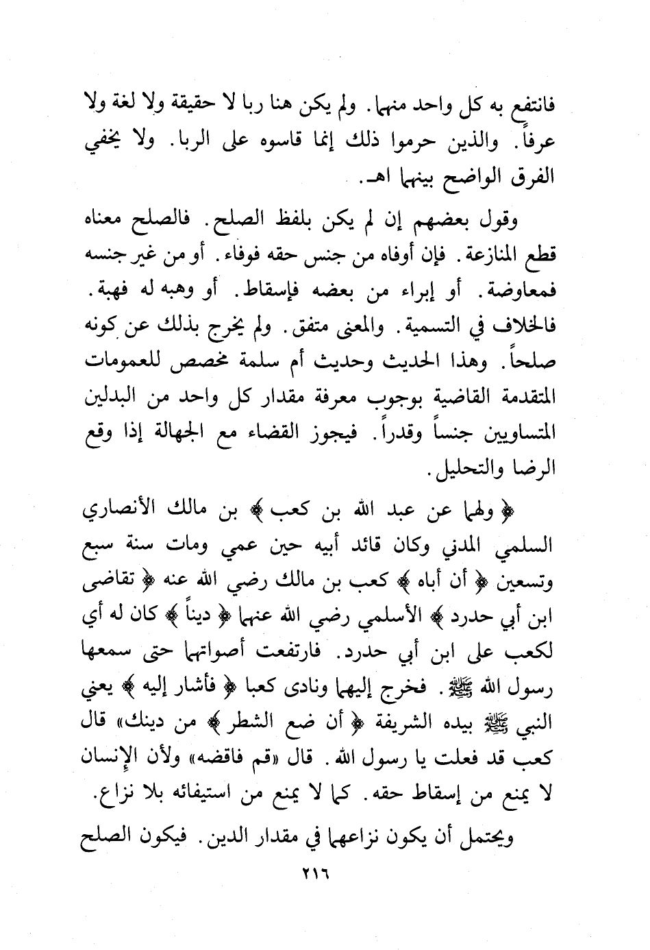 (ولهما عن عبد الله بن كعب) ابن مالك الأنصاري السلمي المدني وكان قائد أبيه حين عمي ومات سنة سبع وتسعين (أن أباه) كعب بن مالك -رضي الله عنه- (تقاضى ابن أبي حدرد) الأسلمي -رضي الله عنهما- (دينًا) كان له أي لكعب على ابن أبي حدرد. فارتفعت أصواتهما حتى سمعها رسول الله - صلى الله عليه وسلم - فخرج إليهما ونادى كعبًا (فأشار إليه) يعني النبي - صلى الله عليه وسلم - بيده الشريفة (أن ضع الشطر) من دينك" قال كعب قد فعلت يا رسول الله. قال "قم فاقضه" ولأن الإنسان لا يمنع من إسقاط حقه. كما لا يمنع من استيفائه بلا نزاع.