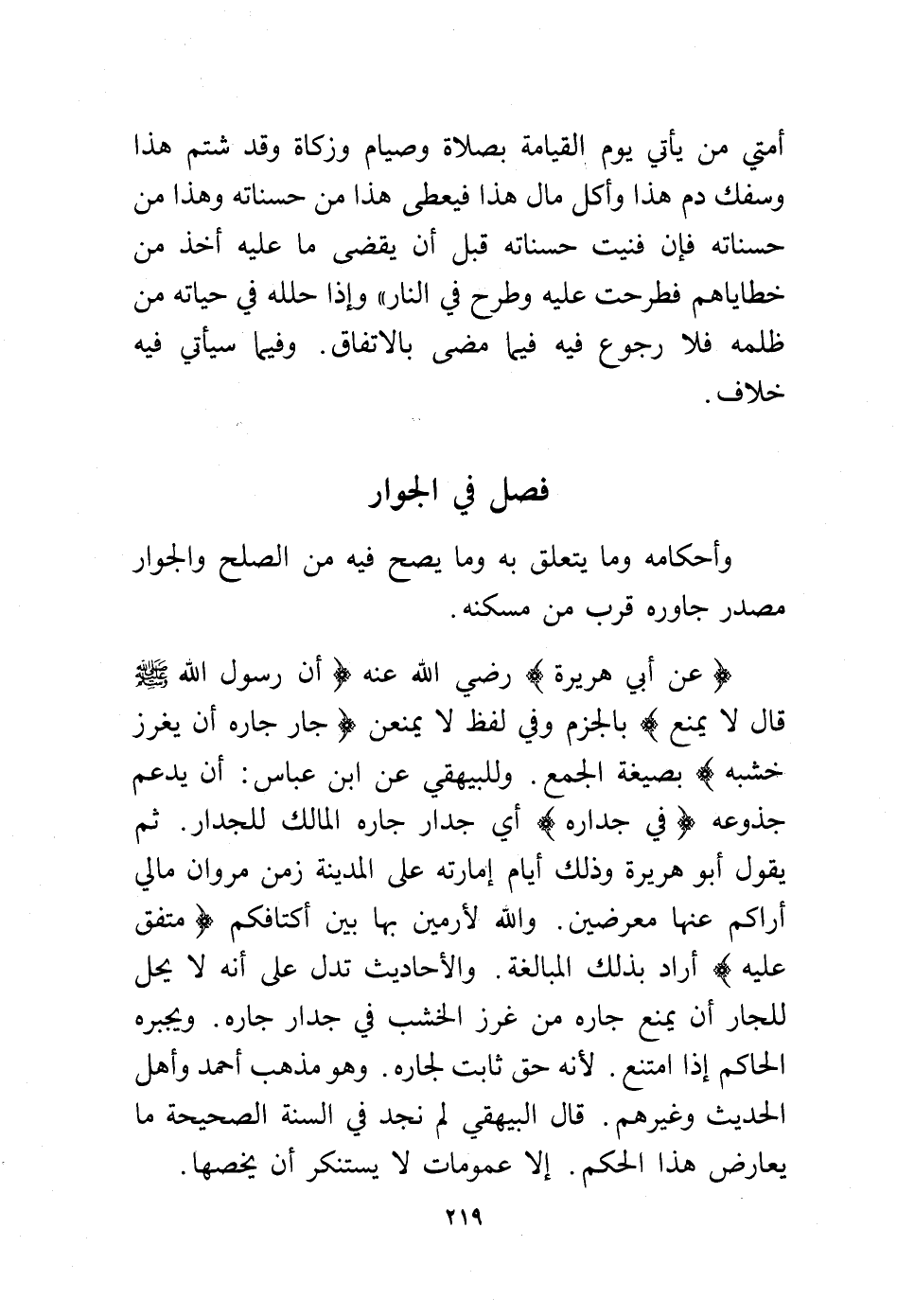 (وعن أبي هريرة) -رضي الله عنه- (أن رسول الله - صلى الله عليه وسلم - قال لا يمنع) بالجزم وفي لفظ لا يمنعن (جار جاره أن يغرز خشبه) بصيغة الجمع. وللبيهقي عن ابن عباس: أن يدعم جذوعه (في جداره) أي جدار جاره المالك للجدار. ثم يقول أبو هريرة وذلك أيام إمارته على المدينة زمن مروان مالي أراكم عنها معرضين. والله لأرمين بها بين أكتافكم (متفق عليه) أراد بذلك المبالغة. والأحاديث تدل على أنه لا يحل للجار أن يمنع جاره من غرز الخشب في جدار جاره. ويجبره الحاكم إذا امتنع. لأنه حق ثابت لجاره. وهو مذهب أحمد وأهل الحديث وغيرهم. قال البيهقي لم نجد في السنة الصحيحة ما يعارض هذا الحكم. إلا عمومات لا يستنكر أن يخصها.