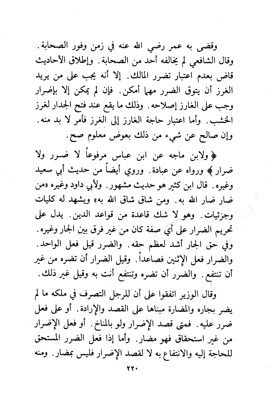 وقال الوزير اتفقوا على أن للرجل التصرف في ملكه ما لم يضر بجاره والمضارة مبناها على القصد والإرادة. أو على فعل ضرر عليه. فمتى قصد الإضرار ولو بالمناخ. أو فعل الإضرار من غير استحقاق فهو مضار. وأما إذا فعل الضرر المستحق للحاجة إليه والانتفاع به لا لقصد الإضرار فليس بمضار. ومنه