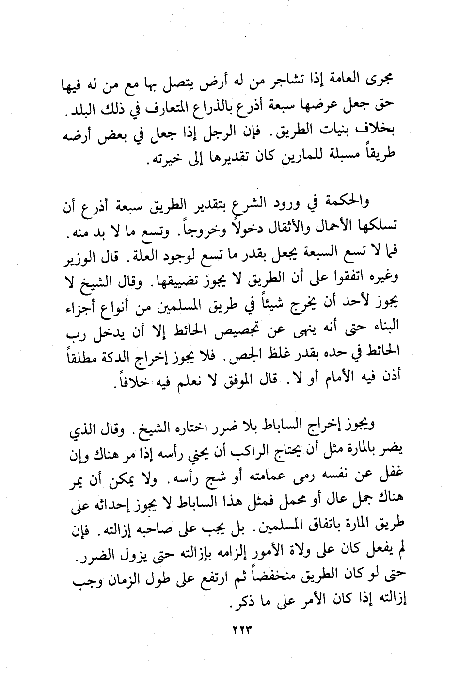 والحكمة في ورود الشرع بتقدير الطريق سبعة أذرع أن تسلكها الأحمال والأثقال دخولًا وخروجًا. وتسع ما لابد منه. فما لا تسع السبعة يجعل بقدر ما تسع لوجود العلة. قال الوزير وغيره اتفقوا على أن الطريق لا يجوز تضييقها. وقال الشيخ لا يجوز لأحد أن يخرج شيئًا في طريق المسلمين من أنواع أجزاء البناء حتى أنه ينهى عن تجصيص الحائط إلا أن يدخل رب الحائط في حده بقدر غلظ الجص. فلا يجوز إخراج الدكة مطلقًا أذن فيه الأمام أو لا. قال الموفق لا نعلم فيه خلافًا.