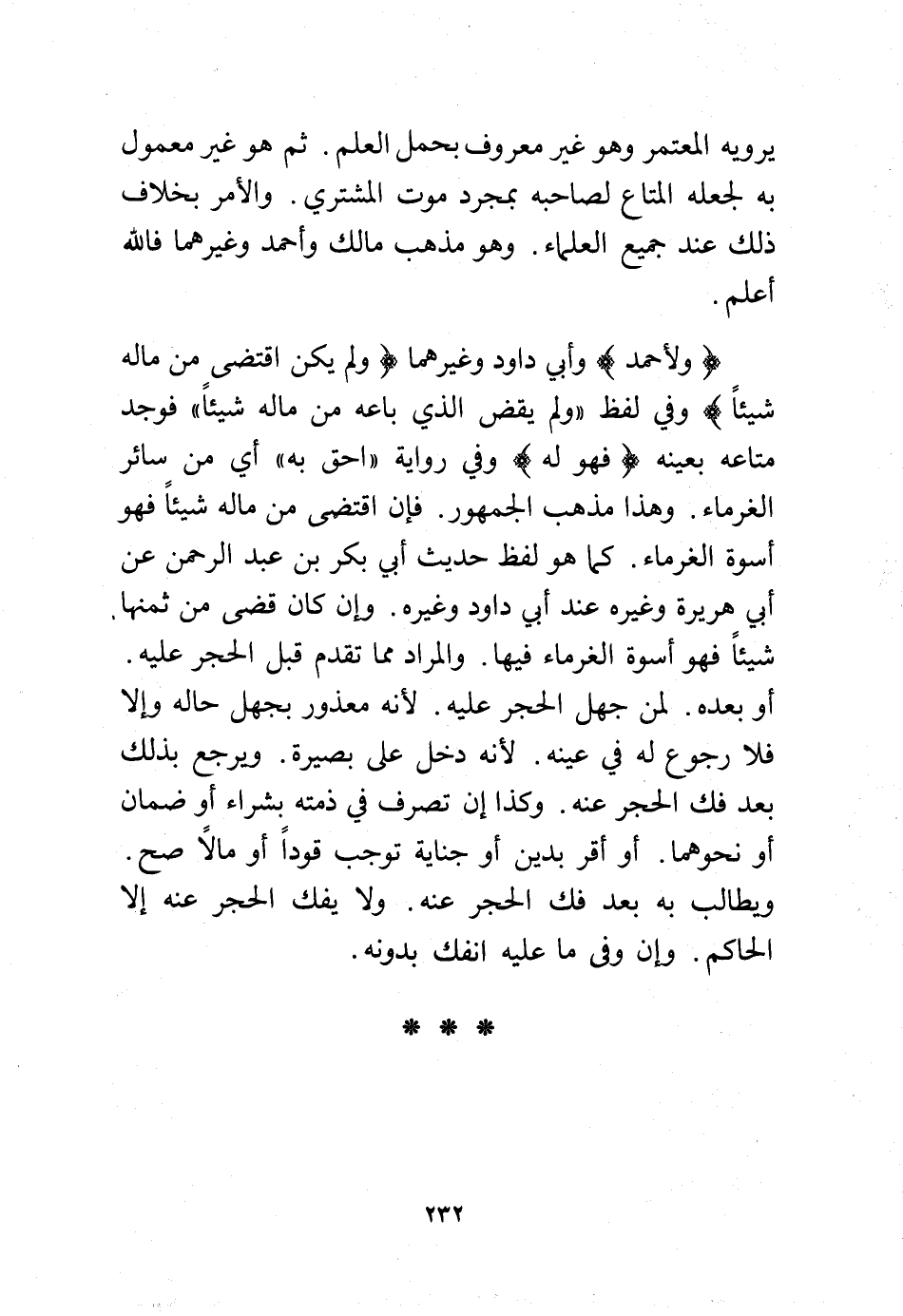 (ولأحمد) وأبي داود وغيرهما (ولم يكن اقتضى من ماله شيئًا) وفي لفظ "ولم يقض الذي باعه من ماله شيئًا" فوجد متاعه بعينه (فهو له) وفي رواية "أحق به" أي من سائر الغرماء. وهذا مذهب الجمهور. فإن اقتضى من ماله شيئًا فهو أسوة الغرماء. كما هو لفظ حديث أبي بكر بن عبد الرحمن عن أبي هريرة وغيره عند أبي داود وغيره. وإن كان قضى من ثمنها. شيئًا فهو أسوة الغرماء فيها. والمراد مما تقدم قبل الحجر عليه. أو بعده. لمن جهل الحجر عليه. لأنه معذور بجهل حاله وإلا فلا رجوع له في عينه. لأنه دخل على بصيرة. ويرجع بذلك بعد فك الحجر عنه. وكذا إن تصرف في ذمته بشراء أو ضمان أو نحوهما. أو أقر بدين أو جناية توجب قودًا أو مالًا صح. ويطالب به بعد فك الحجر عنه. ولا يفك الحجر عنه إلا الحاكم. وإن وفى ما عليه انفك بدونه.