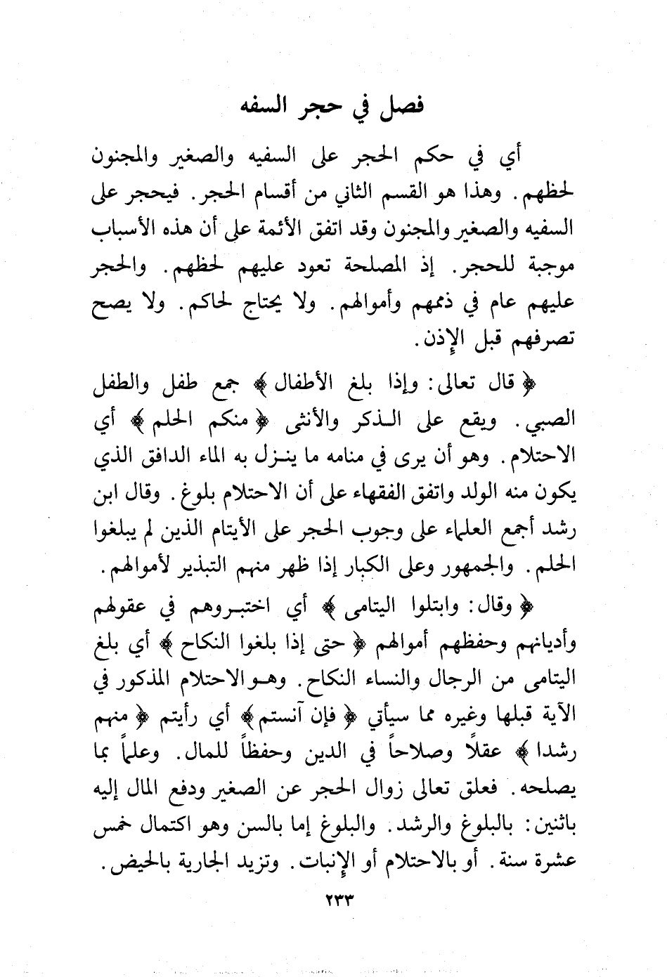 قال تعالى: {وَإِذَا بَلَغَ الأَطْفَالُ} جمع طفل والطفل الصبي. ويقع على الذكر والأنثى {مِنكُمُ الْحُلُمَ} أي الاحتلام. وهو أن يرى في منامه ما ينزل به الماء الدافق الذي يكون منه الولد واتفق الفقهاء على أن الاحتلام بلوغ. وقال ابن رشد أجمع العلماء على وجوب الحجر على الأيتام الذين لم يبلغوا الحلم. والجمهور وعلى الكبار إذا ظهر منهم التبذير لأموالهم.