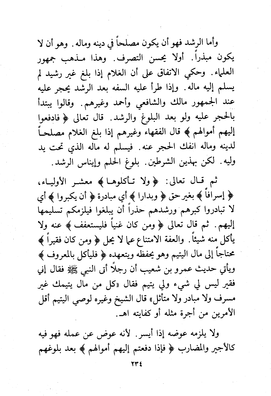 وأما الرشد فهو أن يكون مصلحًا في دينه وماله. وهو أن لا يكون مبذرًا. أولا يحسن التصرف. وهذا مذهب جمهور العلماء. وحكي الاتفاق على أن الغلام إذا بلغ غير رشيد لم يسلم إليه ماله. وإذا طرأ عليه السفه بعد الرشد يحجر عليه عند الجمهور مالك والشافعي وأحمد وغيرهم. وقالوا يبتدأ بالحجر عليه ولو بعد البلوغ والرشد. قال تعالى: {فَادْفَعُواْ إِلَيْهِمْ أَمْوَالَهُمْ} قال الفقهاء وغيرهم إذا بلغ الغلام مصلحًا لدينه وماله إنفك الحجر عنه. فيسلم له ماله الذي تحت يد وليه. لكن بهذين الشرطين. بلوغ الحلم وإيناس الرشد.