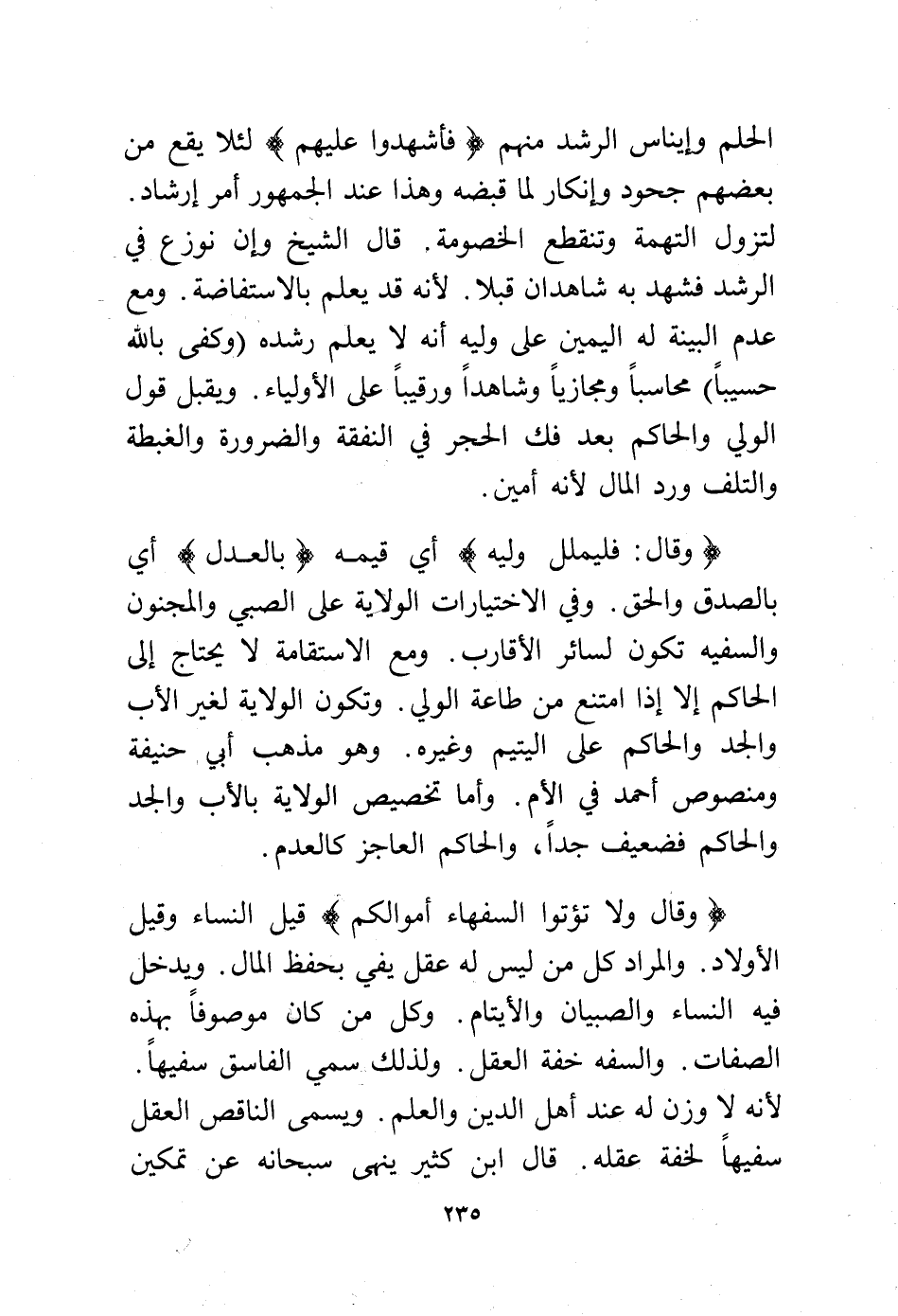 (وقال: {فَلْيُمْلِلْ وَلِيُّهُ} أي قيمه {بِالْعَدْلِ} أي بالصدق والحق. وفي الاختيارات الولاية على الصبي والمجنون والسفيه تكون لسائر الأقارب. ومع الاستقامة لا يحتاج إلا الحاكم إلا إذا امتنع من طاعة الولي. وتكون الولاية لغير الأب والجد والحاكم على اليتيم وغيره. وهو مذهب أبو حنيفة ومنصوص أحمد في الأم. وأما تخصيص الولاية بالأب والجد والحاكم فضعيف جدًا، والحاكم العاجز كالعدم.
