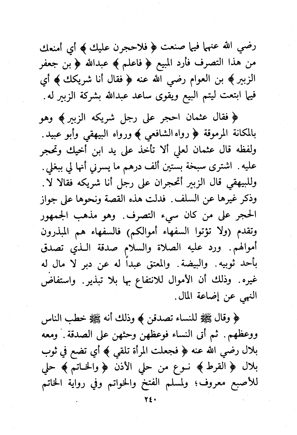 -رضي الله عنهما- فيما صنعت (فلاحجرن عليك) أي أمنعك من هذا التصرف فأرد المبيع (فاعلم) عبد الله (بن جعفر الزبير) بن العوام -رضي الله عنه- (فقال أنا شريكك) أي فيما ابتعت ليتم البيع ويقوى ساعد عبد الله بشركة الزبير له) (فقال عثمان: احجر على رجل شريكه الزبير) وهو بالمكانة المرموقة (رواه الشافعي) ورواه البيهقي وأبو عبيد. ولفظه قال عثمان لعلي ألا تأخذ على يد ابن أخيك وتحجر عليه. اشترى سبخة بستين ألف درهم ما يسرني أنها لي ببغلي.