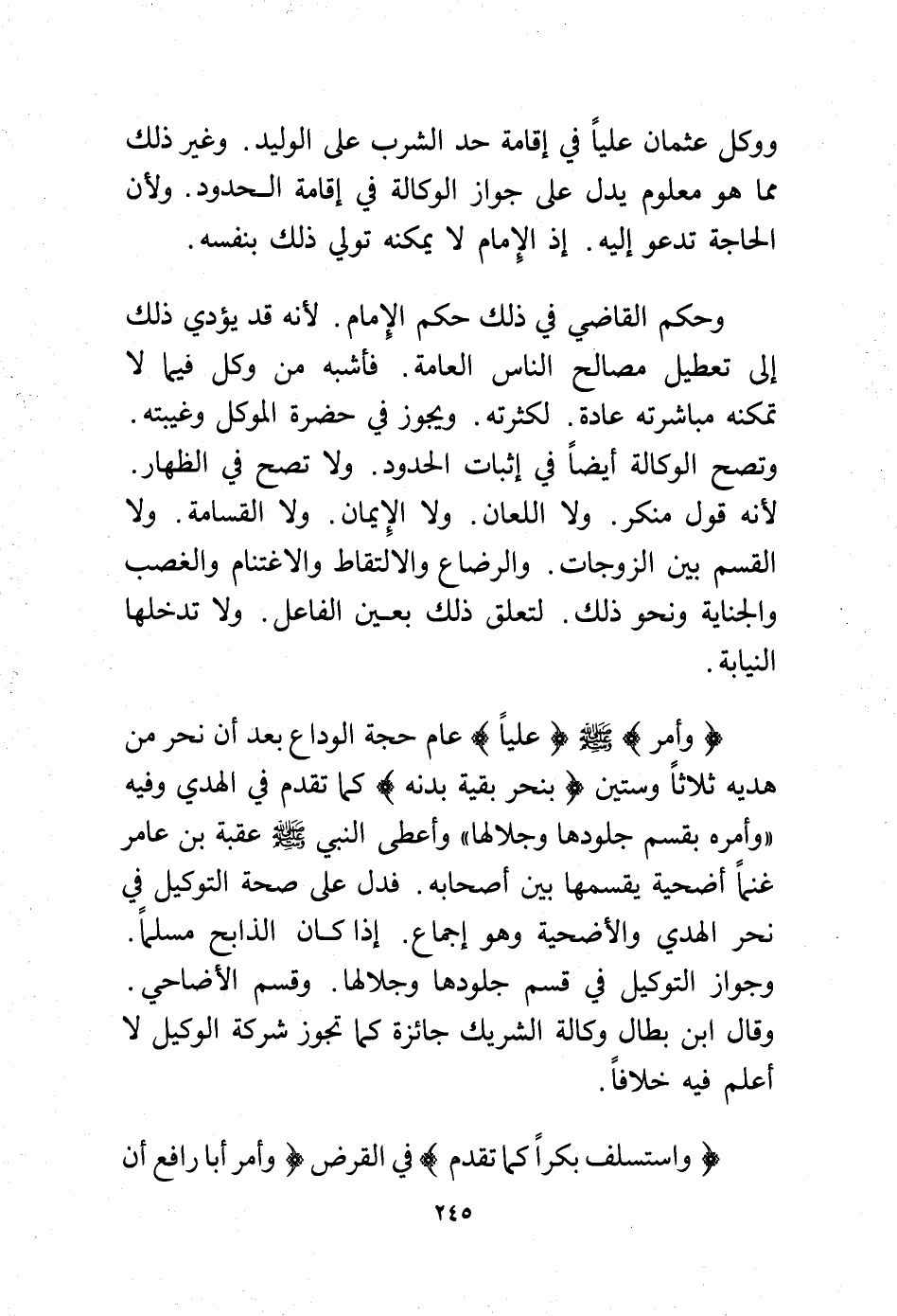 (وأمر) - صلى الله عليه وسلم - (عليًا) عام حجة الوداع بعد أن نحر من هديه ثلاثًا وستين (بنحر بقية بدنه) كما تقدم في الهدي وفيه "وأمره بقسم جلودها وجلالها" وأعطى النبي - صلى الله عليه وسلم - عقبة بن عامر غنمًا أضحية يقسمها بين أصحابه. فدل على صحة التوكيل في نحر الهدي والأضحية وهو إجماع. إذا كان الذابح مسلمًا. وجواز التوكيل في قسم جلودها وجلالها. وقسم الأضاحي. وقال ابن بطال وكالة الشريك جائزة كما تجوز شركة الوكيل لا أعلم فيه خلافًا.