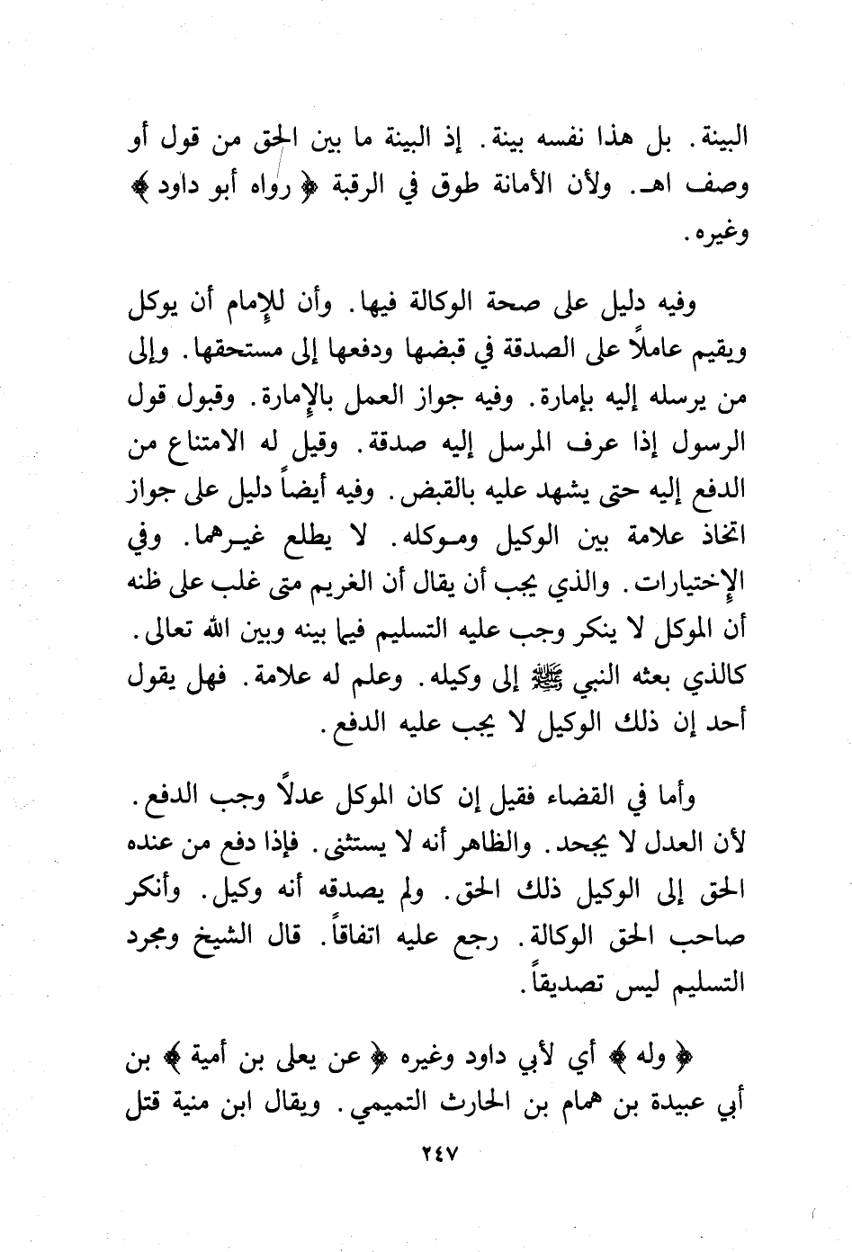 وفيه دليل على صحة الوكالة فيها. وأن للإمام أن يوكل ويقيم عاملًا على الصدقة في قبضها ودفعها إلى مستحقها. وإلى من يرسله إليه بإمارة. وفيه جواز العمل بالإمارة. وقبول قول الرسول إذا عرف المرسل إليه صدقة. وقيل له الامتناع من الدفع إليه حتى يشهد عليه بالقبض. وفيه أيضًا دليل على جواز اتخاذ علامة بين الوكيل وموكله. لا يطلع غيرهما. وفي الاختيارات. والذي يجب أن يقال أن الغريم متى غلب على ظنه أن الموكل لا ينكر وجب عليه التسليم فيما بينه وبين الله تعالى كالذي بعثه النبي - صلى الله عليه وسلم - إلى وكيله وعلم له علامة. فهل يقول أحد إن ذلك الوكيل لا يجب عليه الدفع؟.
