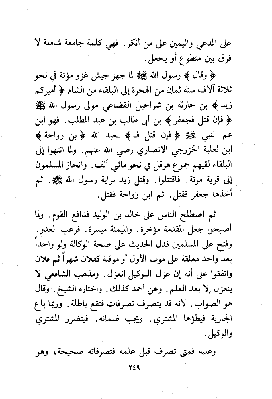 ثم اصطلح الناس على خالد بن الوليد فدافع القوم. ولما أصبحوا جعل المقدمة مؤخرة. والميمنة ميسرة. فرعب العدو. وفتح على المسلمين فدل الحديث على صحة الوكالة ولو واحدًا بعد واحد معلقة على موت الأول أو مؤقته كفلان شهرًا ثم فلان واتفقوا على أنه إن عزل الوكيل انعزل. ومذهب الشافعي لا ينعزل إلا بعد العلم. وعن أحمد كذلك. واختاره الشيخ. وقال هو الصواب. لأنه قد يتصرف تصرفات فتقع باطلة. وربما باع الجارية فيطؤها المشتري. ويجب ضمانه فيتضرر المشتري والوكيل.
