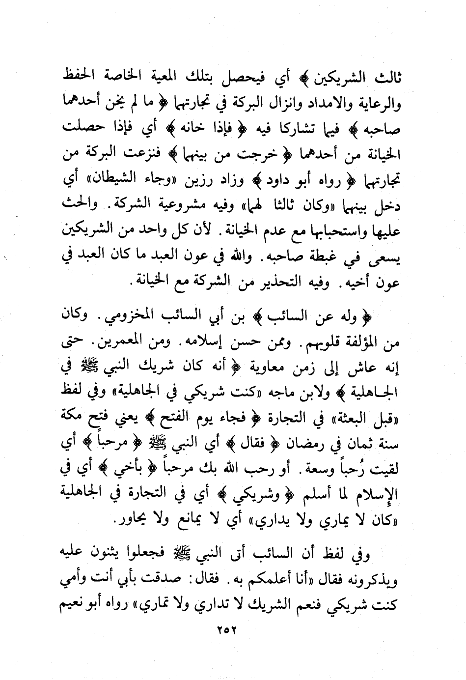 وفي لفظ أن السائب أتى النبي - صلى الله عليه وسلم - فجعلوا يثنون عليه ويذكرونه فقال "أنا أعلمكم به. فقال: صدقت بأبي أنت وأمي كنت شريكي فنعم الشريك لا تداري ولا تماري" رواه أبو نعيم