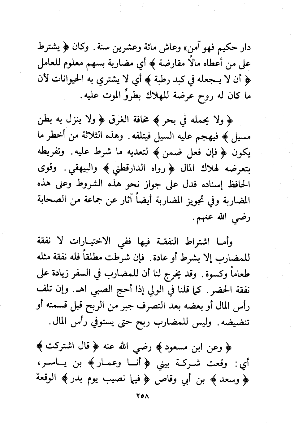 (ولا يحمله في بحر) مخافة الغرق (ولا ينزل به بطن مسيل) فيهجم عليه السيل فيتلفه. وهذه الثلاثة من أخطر ما يكون (فإن فعل ضمن) لتعديه ما شرط عليه. وتفريطه بتعرضه لهلاك المال (رواه الدارقطني) والبيهقي. وقوى الحافظ إسناده فدل على جواز نحو هذه الشروط وعلى هذه المضاربة وفي تجويز المضاربة أيضًا آثار عن جماعة من الصحابة –رضي الله عنهم.