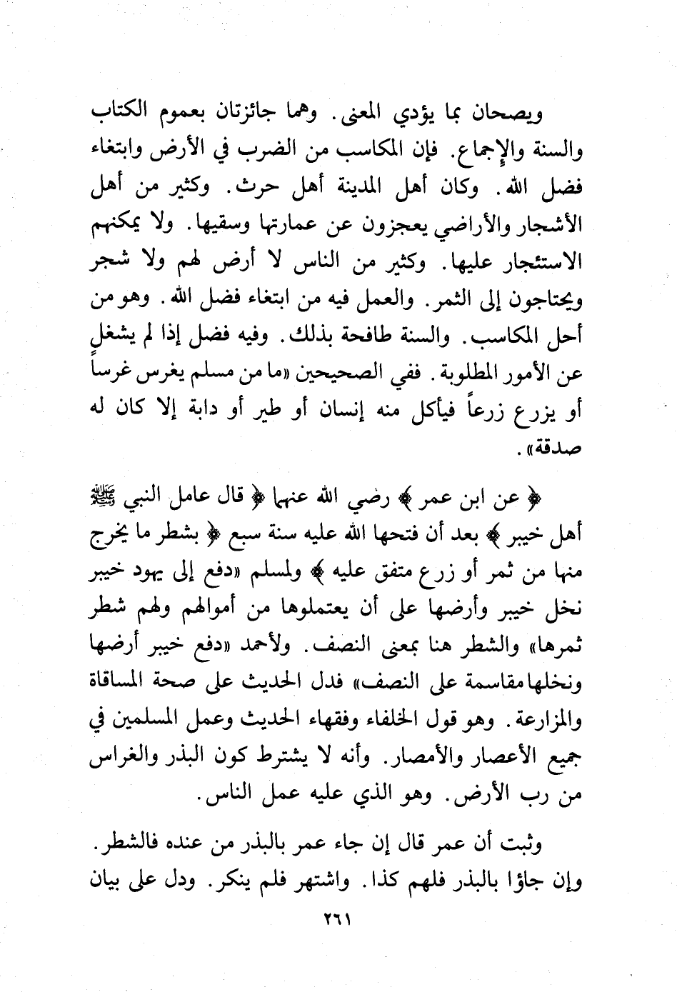 (عن ابن عمر) -رضي الله عنهما- (قال عامل النبي - صلى الله عليه وسلم - أهل خيبر) بعد أن فتحها الله عليه سنة سبع (بشطر ما يخرج منها من ثمر أو زرع متفق عليه) ولمسلم "دفع إلى يهود خيبر نخل خيبر وأرضها على أن يعتملوها من أموالهم ولهم شطر ثمرها" والشطر هنا بمعنى النصف. ولأحمد "دفع خيبر أرضها ونخلها مقاسمة على النصف" فدل الحديث على صحة المساقاة والمزارعة. وهو قول الخلفاء وفقهاء الحديث وعمل المسلمين في جميع الأعصار والأمصار. وأنه لا يشترط كون البذر والغراس من رب الأرض. وهو الذي عليه عمل الناس.