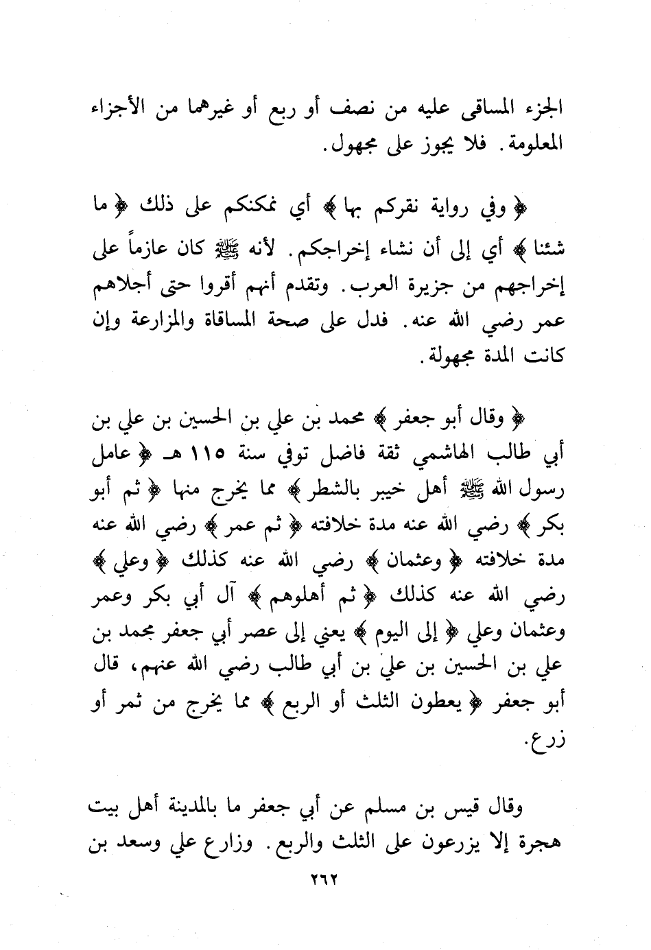 (وقال أبو جعفر) محمد بن علي بن الحسين بن علي بن أبي طالب الهاشمي ثقة فاضل توفي سنة 115هـ (عامل رسول الله - صلى الله عليه وسلم - أهل خيبر بالشطر) مما يخرج منها (ثم أبو بكر) -رضي الله عنه- مدة خلافته (ثم عمر) -رضي الله عنه- مدة خلافته (وعثمان) -رضي الله عنه- كذلك (وعلي) -رضي الله عنه- كذلك (ثم أهلوهم) آل أبي بكر وعمر وعثمان وعلي (إلى اليوم) يعني إلى عصر أبي جعفر محمد بن علي بن الحسين بن علي بن أبي طالب رضي الله عنهم, قال أبو جعفر (يعطون الثلث والربع) مما يخرج من ثمر أو زرع.