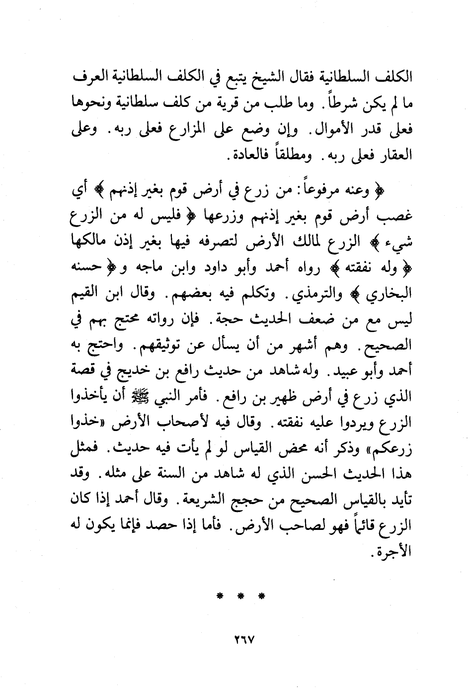 (وعنه مرفوعًا: من زرع في أرض قوم بغير إذنهم) أي غصب أرض قوم بغير إذنهم وزرعها (فليس له من الزرع شيء) الزرع لمالك الأرض لتصرفه فيها بغير إذن مالكها (وله نفقته) رواه أحمد وأبو داود وابن ماجه و (حسنه البخاري) والترمذي. وتكلم فيه بعضهم. وقال ابن القيم ليس مع من ضعف الحديث حجة. فإن رواته محتج بهم في الصحيح. وهم أشهر من أن يسأل عن توثيقهم. واحتج به أحمد وأبو عبيد. وله شاهد من حديث رافع بن خديج في قصة الذي زرع في أرض ظهير بن رافع. فأمر النبي - صلى الله عليه وسلم - أن يأخذوا الزرع ويردوا عليه نفقته. وقال فيه: لأصحاب الأرض "خذوا زرعكم" وذكر أنه محض القياس لو لم يأت فيه حديث. فمثل هذا الحديث الحسن الذي له شاهد من السنة على مثله. وقد تأيد بالقياس الصحيح من حجج الشريعة. وقال أحمد إذا كان الزرع قائمًا فهو لصاحب الأرض. فأما إذا حصد فإنما يكون له الأجرة.