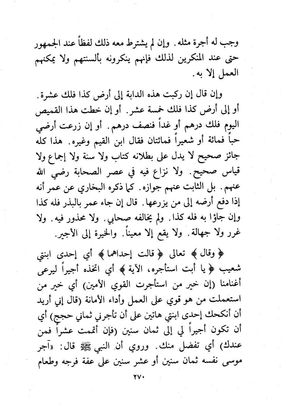 (وقال) تعالى {قَالَتْ إِحْدَاهُمَا} أي إحدى ابنتي شعيب {يَا أَبَتِ اسْتَأْجِرْهُ} الآية) اتخذ أجيرًا ليرعى أغنامنا {إِنَّ خَيْرَ مَنِ اسْتَأْجَرْتَ الْقَوِيُّ الأَمِين} أي خير من استعملت من هو قوي على العمل وأداء الأمانة {قَالَ إِنِّي أُرِيدُ أَنْ أُنكِحَكَ إِحْدَى ابْنَتَيَّ هَاتَيْنِ عَلَى أَن تَأْجُرَنِي ثَمَانِيَ حِجَجٍ} أي أن تكون أجيرًا لي إلى ثمان سنين {فَإِنْ أَتْمَمْتَ عَشْرًا فَمِنْ
