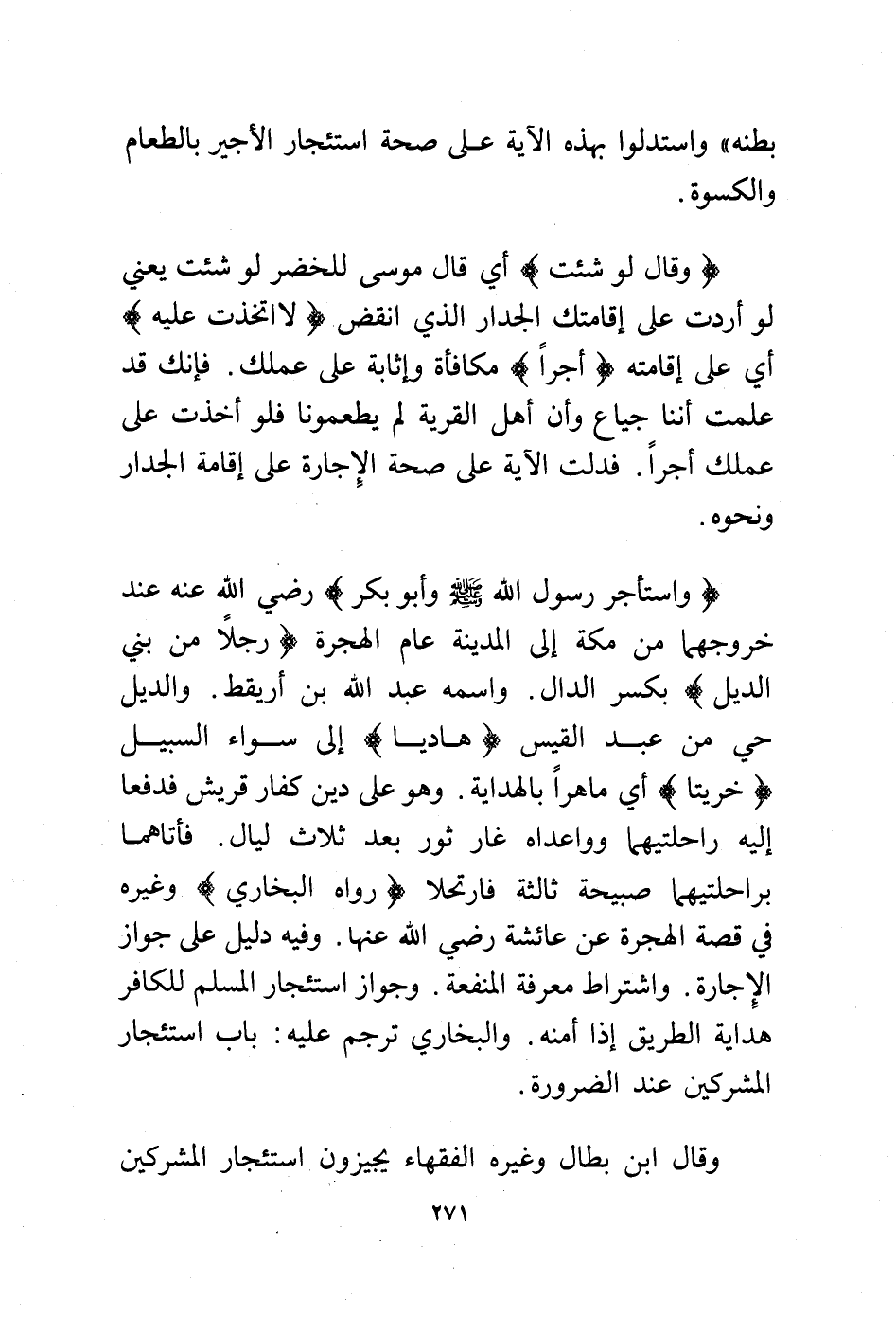 (واستأجر رسول الله - صلى الله عليه وسلم - وأبو بكر) -رضي الله عنه- عند خروجهما من مكة إلى المدينة عام الهجرة (رجلًا من بني الديل) بكسر الدال. واسمه عبد الله بن أريقط. والديل حي من عبد القيس (هاديا) إلى سواء السبيل (خريتا) أي ماهرًا بالهداية. وهو على دين كفار قريش فدفعا إليه راحلتيهما وواعداه غار ثور بعد ثلاث ليال. فأتاهما براحلتيهما صبيحة ثالثة فارتحلا (رواه البخاري) وغيره في قصة الهجرة عن عائشة رضي الله عنها. وفيه دليل على جواز الإجارة. واشتراط معرفة المنفعة وجواز استئجار المسلم للكافر هداية الطريق إذا أمنه. والبخاري ترجم عليه: باب استئجار المشركين عند الضرورة.