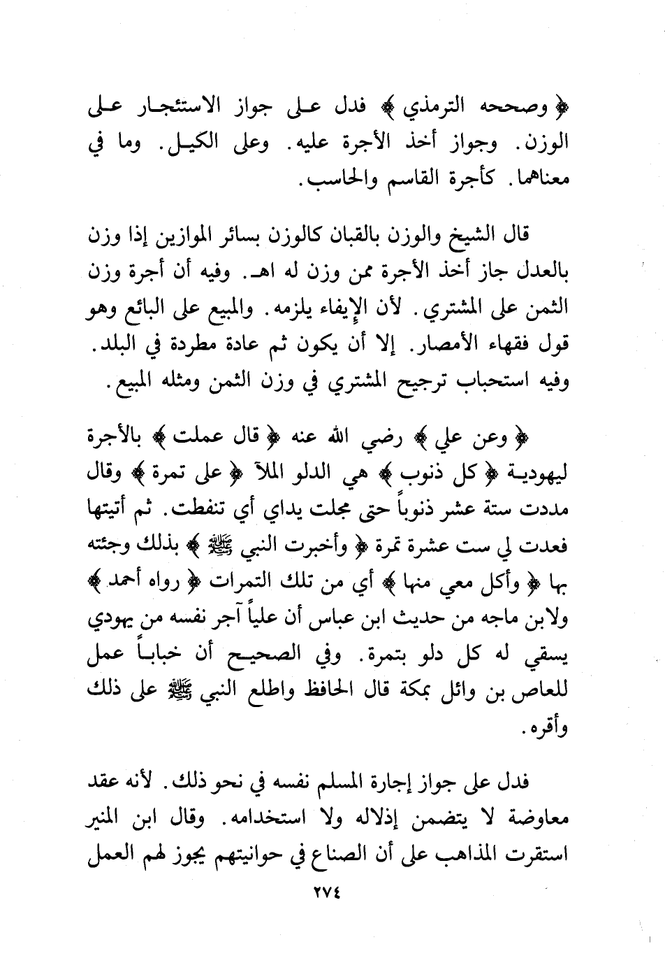 (وعن علي) -رضي الله عنه- (قال عملت) بالأجرة ليهودية (كل ذنوب) هو الدلو الملآ (على تمرة) وقال مددت ستة عشر ذنوبًا حتى مجلت يداي أي تنفطت. ثم أتيتها فعدت لي ست عشرة تمرة (وأخبرت النبي - صلى الله عليه وسلم -) بذلك وجئته بها (وأكل معي منها) أي من تلك التمرات (رواه أحمد) ولابن ماجه من حديث ابن عباس أن عليًا آجر نفسه من يهودي يسقي له كل دلو بتمرة. وفي الصحيح أن خبابًا عمل للعاص بن وائل بمكة قال الحافظ واطلع النبي - صلى الله عليه وسلم - على ذلك وأقره.