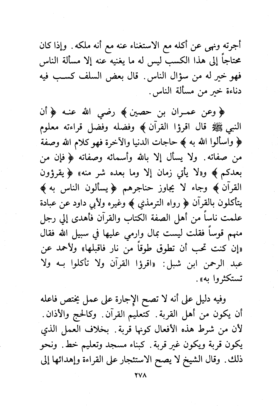 (وعن عمران بن حصين) -رضي الله عنه- (أن النبي - صلى الله عليه وسلم - قال اقرؤا القرآن) وفضله وفضل قراءته معلوم (واسألوا الله به) حاجات الدنيا والآخرة فهو كلام الله وصفة من صفاته. ولا يسأل إلا بالله وأسمائه وصفاته (فإن من بعدكم) و "لا يأتي زمان إلا وما بعده شر منه" (يقرؤون القرآن) وجاء لا يجاوز حناجرهم (يسألون الناس به) يتأكلون بالقرآن (رواه الترمذي) وغيره ولأبي داود عن عبادة علمت ناسًا من أهل الصفة الكتاب والقرآن فأهدى إلى رجل منهم قوسًا فقلت ليست بمال وارمي عليها في سبيل الله فقال "إن كنت تحب أن تطوق طوقًا من نار فاقبلها" ولأحمد عن عبد الرحمن ابن شبل: "اقرؤا القرآن ولا تأكلوا به ولا تستكثروا به".