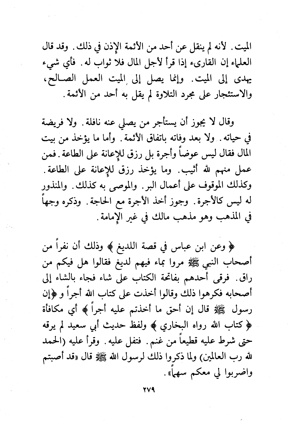 (وعن ابن عباس في قصة اللديغ) وذلك أن نفرًا من أصحاب النبي - صلى الله عليه وسلم - مروا بماء فيهم لديغ فقالوا هل فيكم من راق؟ فرقى أحدهم بفاتحة الكتاب على شاء فجاء بالشاء إلى أصحابه فكرهوا ذلك وقالوا أخذت على كتاب الله أجرًا و (إن رسول الله - صلى الله عليه وسلم - قال إن أحق ما أخذتم عليه أجرًا) أي مكافأة (كتاب الله رواه البخاري) ولفظ حديث أبي سعيد لم يرقه حتى شرط عليه قطيعًا من غنم فتفل عليه وقرأ عليه (الحمد لله رب العالمين) ولما ذكروا ذلك لرسول الله - صلى الله عليه وسلم - قال "قد أصبتم واضربوا لي معكم سهمًا".