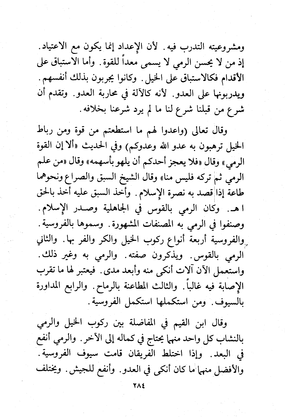 وقال ابن القيم في المفاضلة بين ركوب الخيل والرمي بالنشاب كل واحد منهما يحتاج في كماله إلى الآخر. والرمي أنفع في البعد. وإذا اختلط الفريقان قامت سيوف الفروسية. والأفضل منهما ما كان أنكى في العدو. وأنفع للجيش. ويختلف