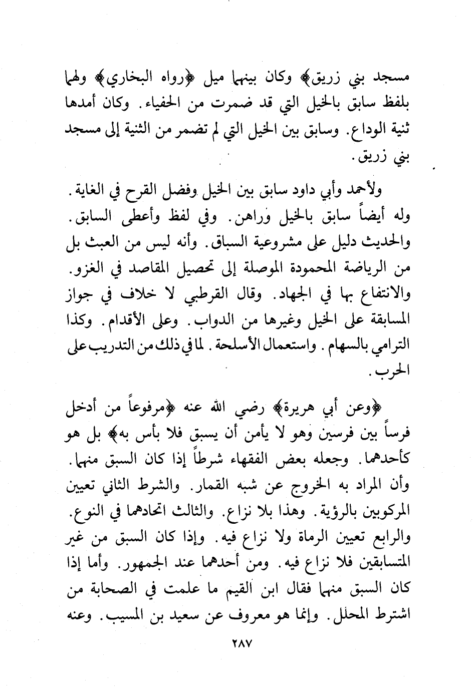 مسجد بني زريق) وكان بينهما ميل (رواه البخاري) ولهما بلفظ سابق بالخيل التي قد ضمرت من الحفياء. وكان أمدها ثنية الوداع. وسابق بين الخيل التي لم تضمر من الثنية إلى مسجد بني زريق.