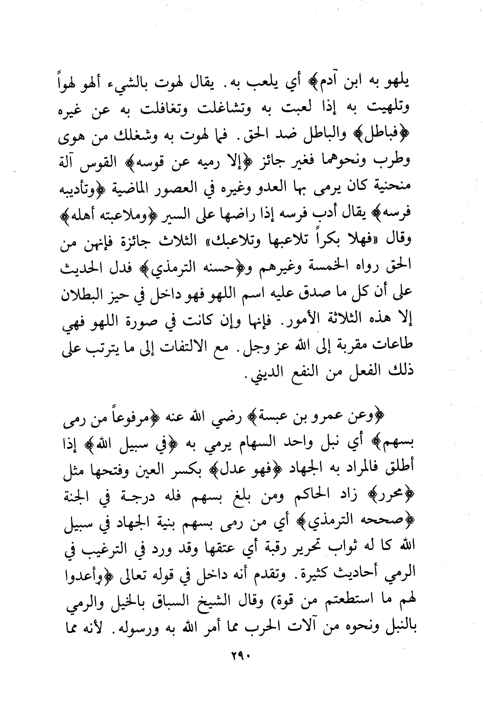 يلهو به ابن آدم) أي يلعب به. يقال لهوت بالشيء ألهو لهوًا وتلهيت به إذا لعبت به وتشاغلت وتغافلت به عن غيره (فباطل) والباطل ضد الحق. فما لهوت به وشغلك من هوى وطرب ونحوهما فغير جائز (إلا رميه عن قوسه) القوس آلة منحنية كان يرمى بها العدو وغيره في العصور الماضية (وتأديبه فرسه) يقال أدب فرسه إذا براضها على السير (وملاعبته أهله) وقال "فهلا بكرًا تلاعبها وتلاعبك" الثلاث جائزة فإنهن من الحق رواه الخمسة وغيرهم و (حسنه الترمذي) فدل الحديث على أن كل ما صدق عليه اسم اللهو فهو داخل في حيز البطلان إلا هذه الثلاثة الأمور. فإنها وإن كانت في صورة اللهو فهي طاعات مقربة إلى الله عز وجل. مع الالتفات إلى ما يترتب على ذلك الفعل من النفع الديني.