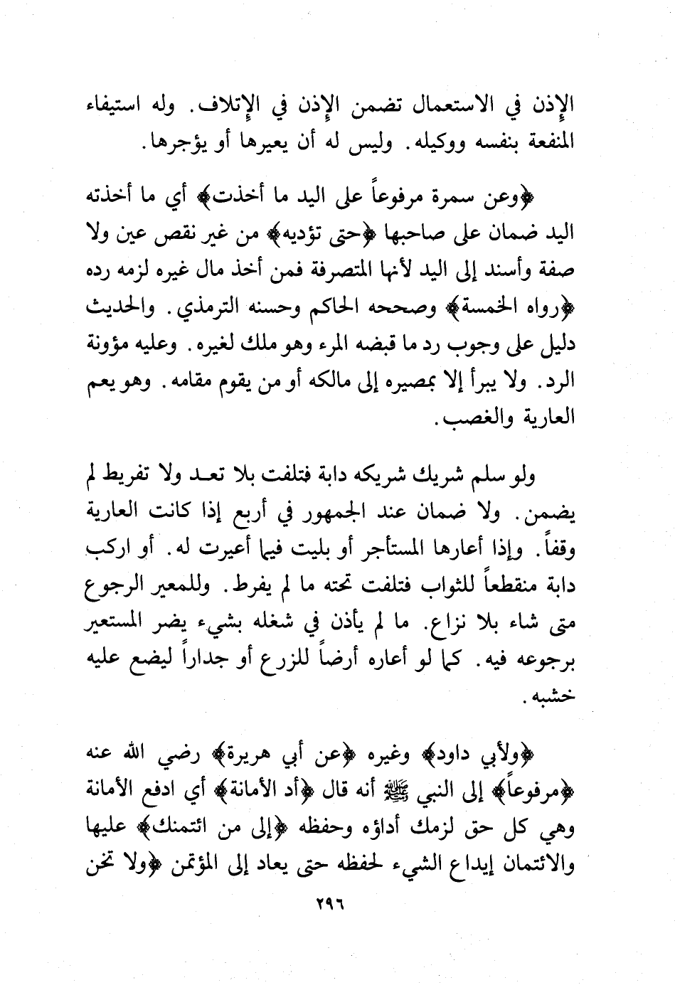 (وعن سمرة مرفوعًا على اليد ما أخذت) أي ما أخذته اليد ضمان على صاحبها (حتى تؤديه) من غير نقص عين ولا صفة وأسند إلى اليد لأنها المتصرفة فمن أخذ مال غيره لزمه رده (رواه الخمسة) وصححه الحاكم وحسنه الترمذي والحديث دليل على وجوب رد ما قبضه المرء وهو ملك لغيره. وعليه مؤونة الرد. ولا يبرأ إلا بمصيره إلى مالكه أو من يقوم مقامه. وهم يعم العارية والغصب.
