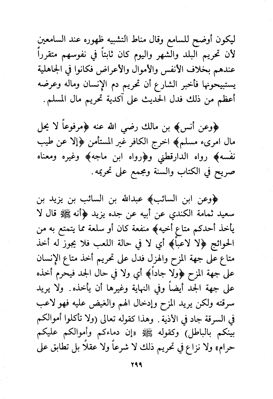 (وعن أنس) بن مالك -رضي الله عنه- (مرفوعاً لا يحل مال امرئ مسلم) اخرج الكافر غير المستأمن (إلا عن طيب نفسه) رواه الدارقطني و (رواه ابن ماجه) وغيره ومعناه صريح في الكتاب والسنة ومجمع على تحريمه.