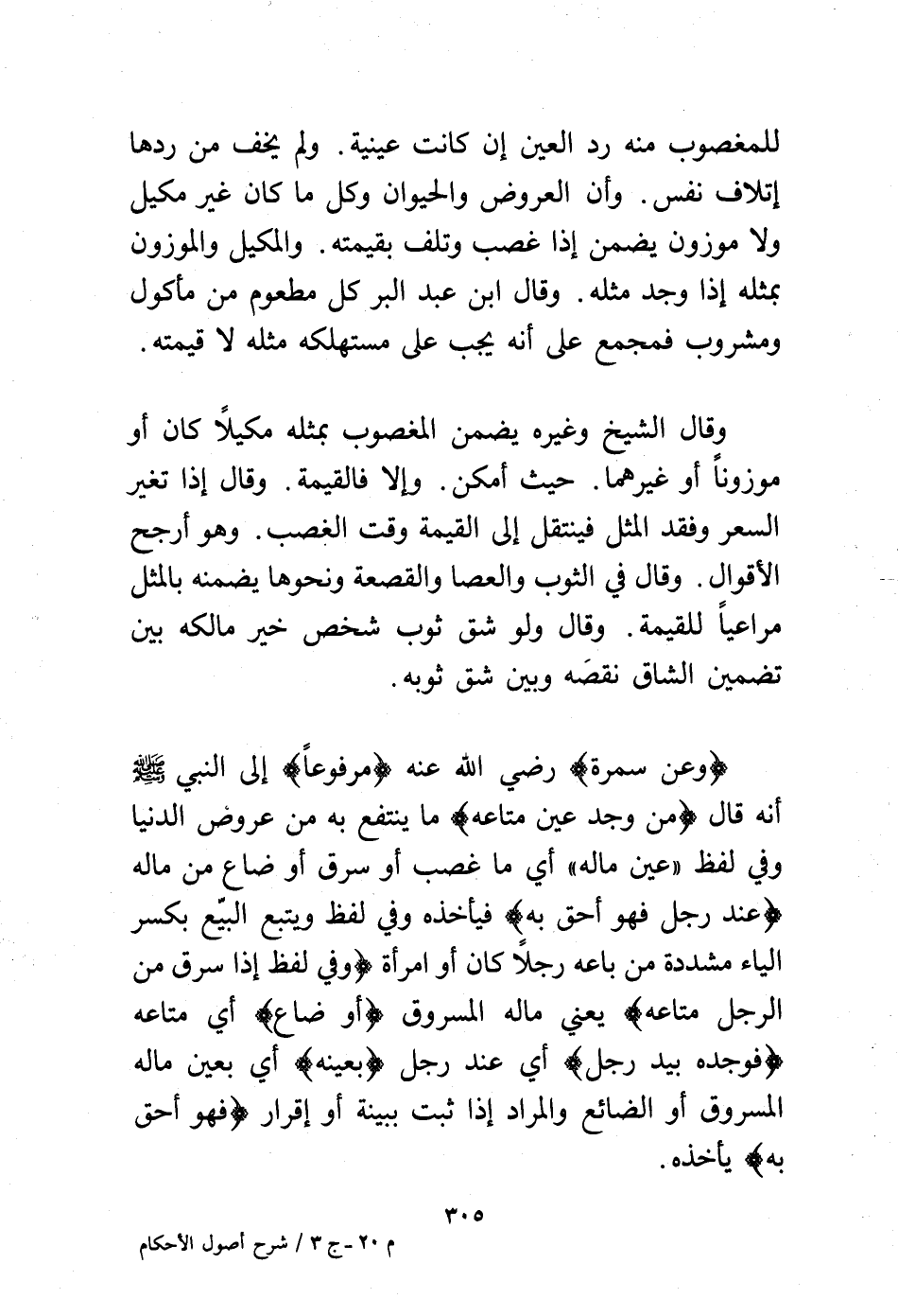 للمغصوب منه رد العين إن كانت عينية. ولم يخف من ردها إتلاف نفس. وأن العروض والحيوان وكل ما كان غير مكيل ولا موزون يضمن إذا غصب وتلف بقيمته. والمكيل والموزون بمثله إذا وجد مثله. وقال ابن عبد البر كل مطعوم من مأكول ومشروب فمجمع على أنه يجب على مستهلكه مثله لا قيمته.