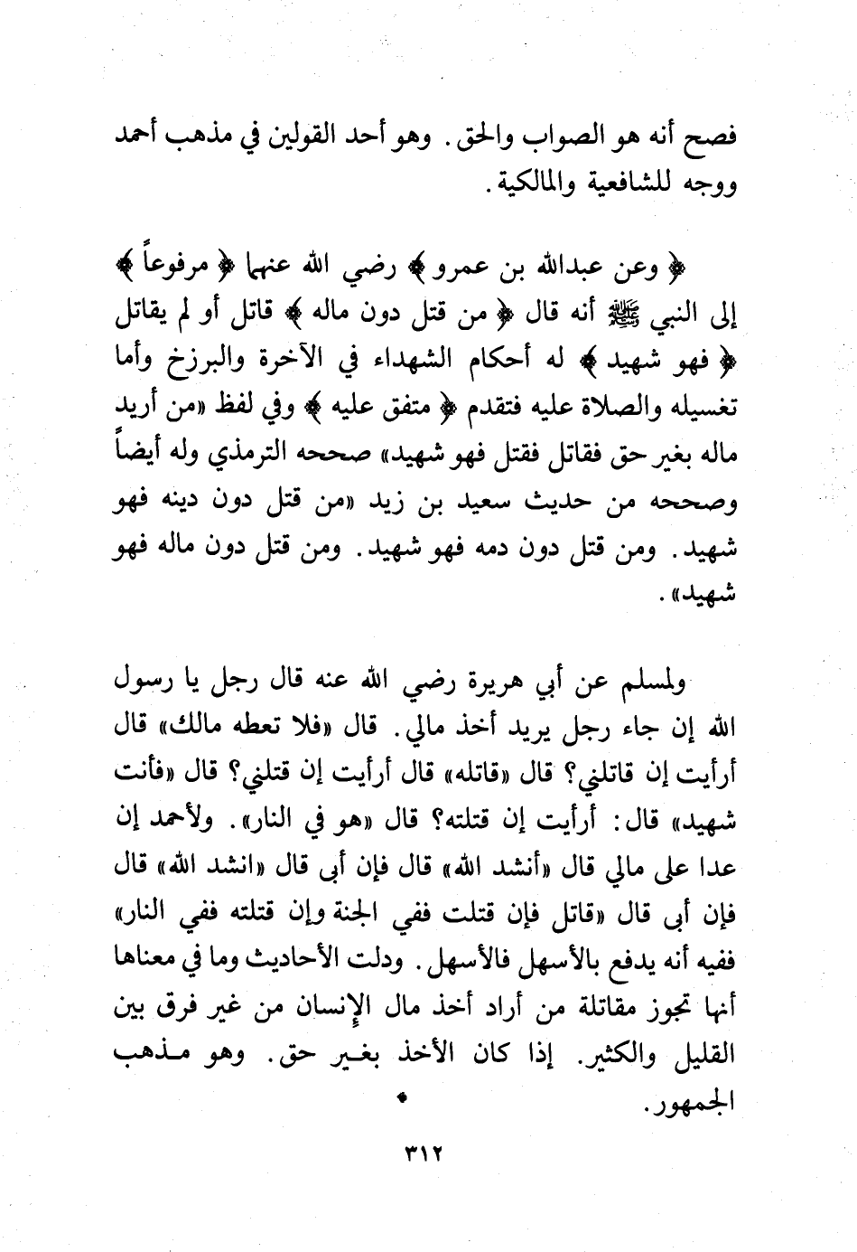 (وعن عبد الله بن عمرو) -رضي الله عنهما- (مرفوعًا) إلى النبي - صلى الله عليه وسلم - أنه قال (من قتل دون ماله) قاتل أو لم يقاتل (فهو شهيد) له أحكام الشهداء في الآخرة والبرزخ وأما تغسيله والصلاة عليه فتقدم (متفق عليه) وفي لفظ "من أريد ماله بغير حق فقاتل فقتل فهو شهيد" صححه الترمذي وله أيضًا وصححه من حديث سعيد بن زيد "من قتل دون دينه فهو شهيد. ومن قتل دون دمه فهو شهيد. ومن قتل دون ماله فهو شهيد".