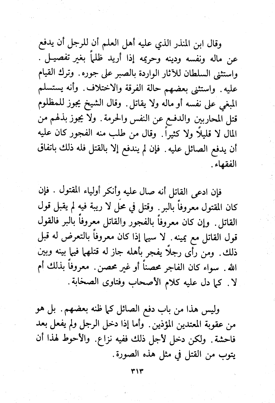 وقال ابن المنذر الذي عليه أهل العلم أن للرجل أن يدفع عن ماله ونفسه ودينه وحريمه إذا أريد ظلمًا بغير تفصيل. واستثنى السلطان للآثار الواردة بالصبر على جوره وترك القيام عليه واستثنى بعضهم حالة الفرقة والاختلاف. وأنه يستسلم المبغي على نفسه أو ماله ولا يقاتل. وقال الشيخ يجوز للمظلوم قتل المحاربين والدفع عن النفس والحرمة. ولا يجوز بذلهم من المال لا قليلًا ولا كثيرًا. وقال من طلب منه الفجور كان عليه أن يدفع الصائل عليه. فإن لم يندفع إلا بالقتل فله ذلك باتفاق الفقهاء.