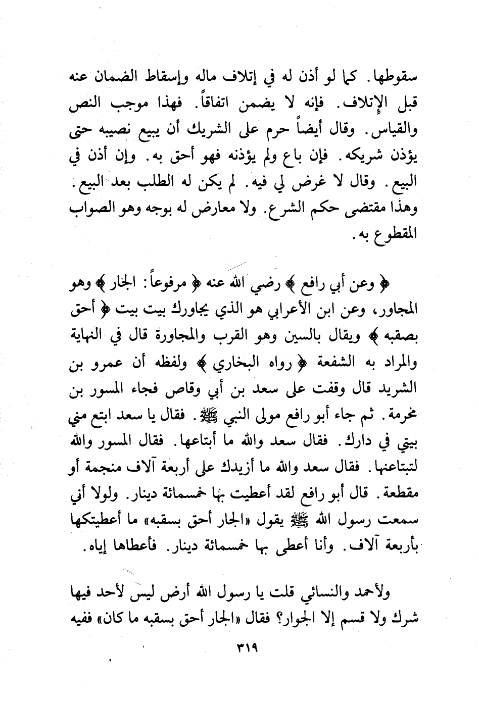 (وعن أبي رافع) -رضي الله عنه- (مرفوعاً: الجار) وهو المجاور, وعن ابن الأعرابي هو الذي يجاورك بيت بيت (أحق بصقبه) ويقال بالسين وهو القرب والمجاورة قال في النهاية والمراد به الشفعة (رواه البخاري) ولفظه أن عمرو بن الشريد قال وقفت على سعد بن أبي وقاص فجاء المسور بن مخرمة. ثم جاء أبو رافع مولى النبي - صلى الله عليه وسلم - فقال يا سعد ابتع مني بيتي في دارك. فقال سعد والله ما أبتاعها. فقال المسور والله لتبتاعنها. فقال سعد والله ما أزيدك على أربعة آلاف منجمة أو مقطعة. قال أبو رافع لقد أعطيت بها خمسمائة دينار. ولولا أني سمعت رسول الله - صلى الله عليه وسلم - يقول "الجار أحق بسقبه" ما أعطيتكها بأربعة آلاف. وأنا أعطى بها خمسمائة دينار. فأعطاها إياه.