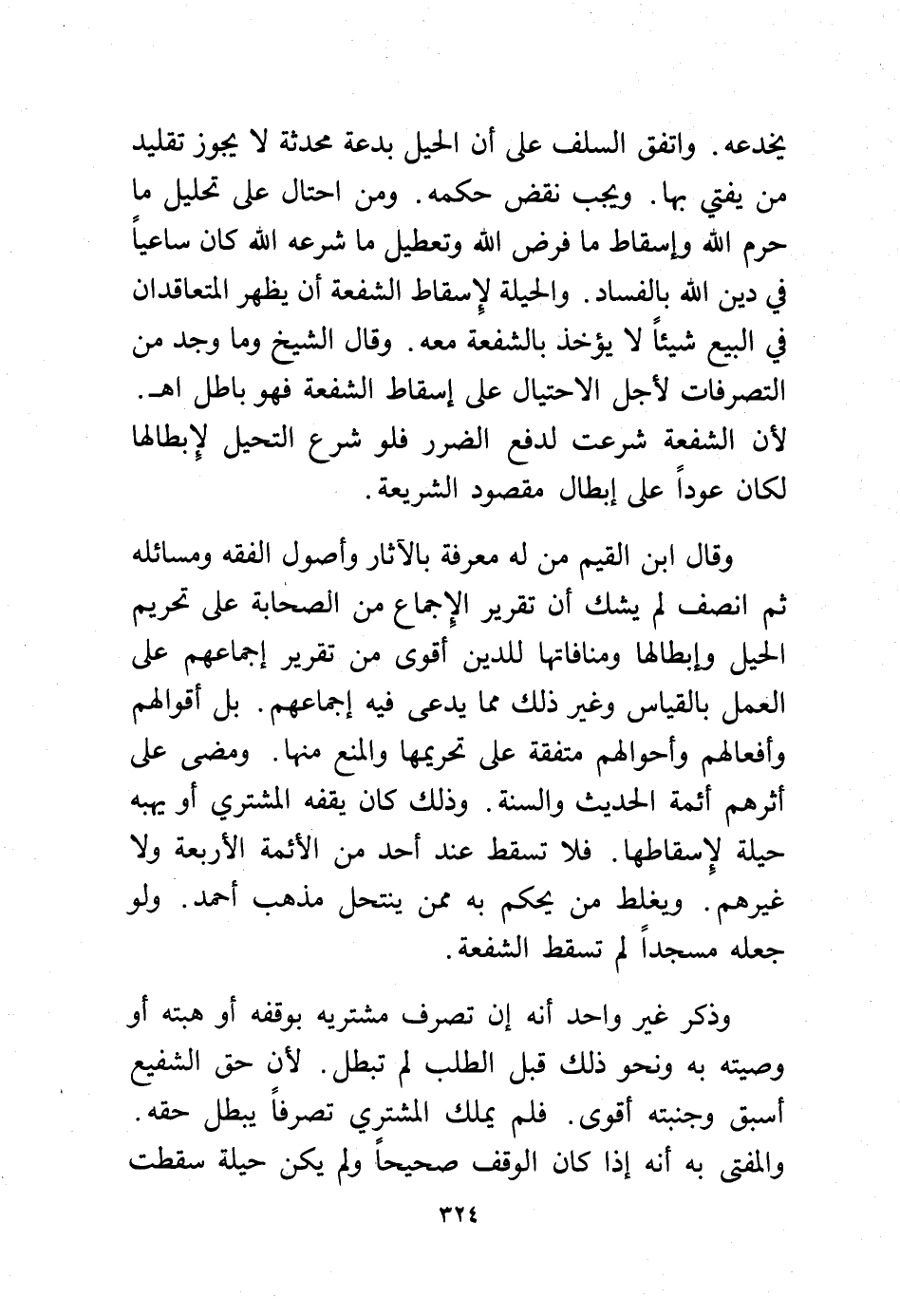 وقال ابن القيم من له معرفة بالآثار وأصول الفقه ومسائله ثم انصف لم يشك أن تقرير الإجماع من الصحابة على تحريم الحيل وإبطالها ومنافاتها للدين أقوى من تقرير إجماعهم على العمل بالقياس وغير ذلك مما يدعى فيه إجماعهم. بل أقوالهم وأفعالهم وأحوالهم متفقة على تحريمها والمنع منها. ومضى على أثرهم أئمة الحديث والسنة. وذلك كان يقفه المشتري أو يهبه حيلة لإسقاطها. فلا تسقط عند أحد من الأئمة الأربعة ولا غيرهم. ويغلط من يحكم به ممن ينتحل مذهب أحمد. ولو جعله مسجدًا لم تسقط الشفعة.