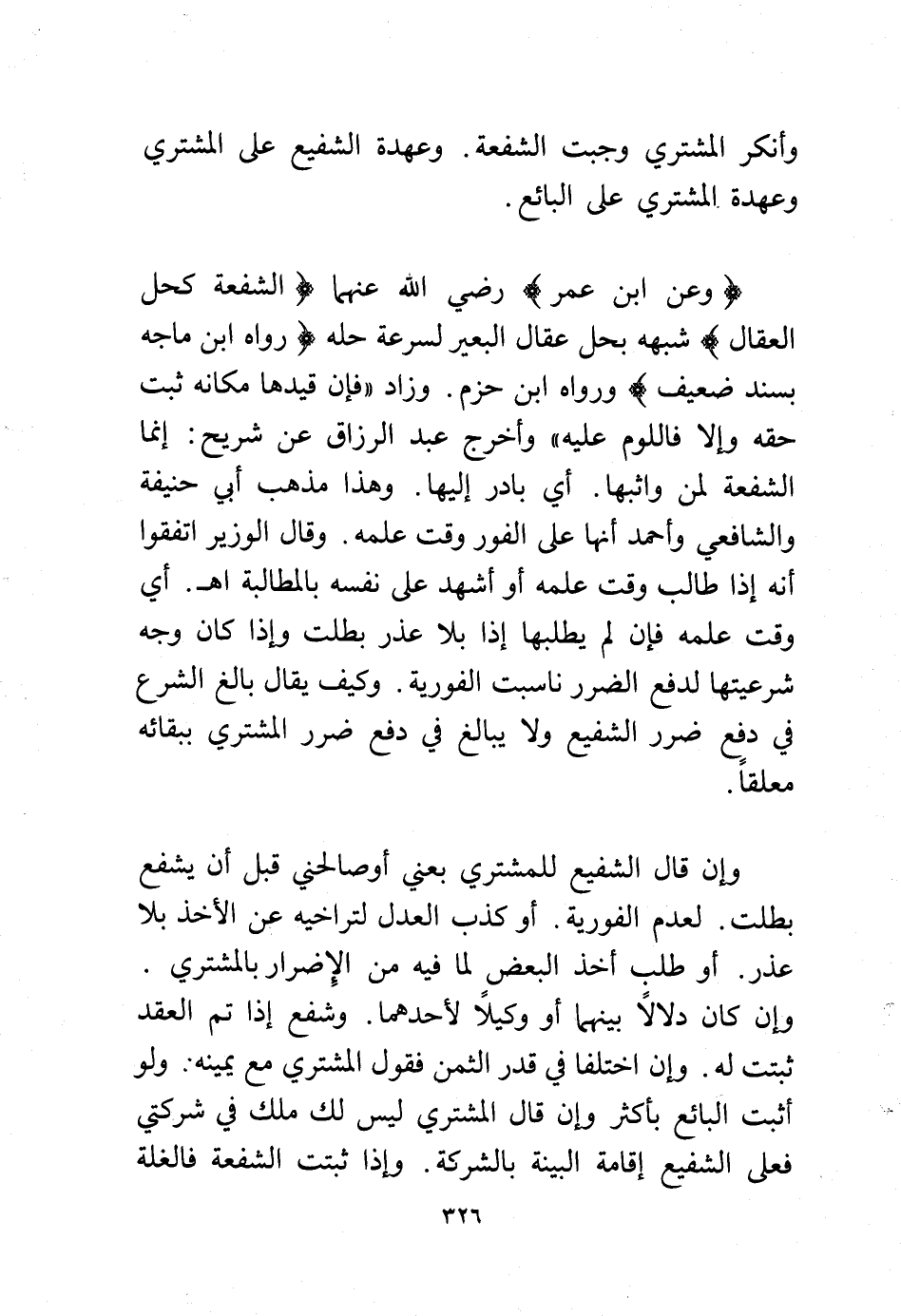(وعن ابن عمر) -رضي الله عنهما- (الشفعة كحل العقال) شبهة بحل عقال البعير لسرعة حله (رواه ابن ماجه بسند ضعيف) ورواه ابن حزم. وزاد "فإن قيدها مكانه ثبت حقه وإلا فاللوم عليه" وأخرج عبد الرزاق عن شريح: إنما الشفعة لمن واثبها. أي بادر إليها. وهذا مذهب أبي حنيفة والشافعي وأحمد أنها على الفور وقت علمه. وقال الوزير اتفقوا أنه إذا طالب وقت علمه أو أشهد على نفسه بالمطالبة اهـ. أي وقت علمه فإن لم يطلبها إذا بلا عذر بطلت وإذا كان وجه شرعيتها لدفع الضرر ناسبت الفورية. وكيف يقال بالغ الشرع في دفع ضرر الشفيع ولا يبالغ في دفع ضرر المشتري ببقائه معلقًا.