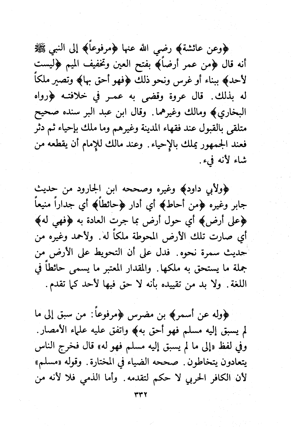 (وعن عائشة) رضي الله عنها (مرفوعًا) إلى النبي - صلى الله عليه وسلم - أنه قال (من عمر أرضًا) بفتح العين وتخفيف الميم (ليست لأحد) ببناء أو غرس ونحو ذلك (فهو أحق بها) وتصير ملكًا له بذلك. قال عروة وقضى به عمر في خلافته (رواه البخاري) ومالك وغيرهما. وقال ابن عبد البر سنده صحيح متلقى بالقبول عند فقهاء المدينة وغيرهم وما ملك بإحياء ثم دثر فعند الجمهور ملك بالإحياء. وعند مالك للإمام أن يقطعه من شاء لأنه فيء.
