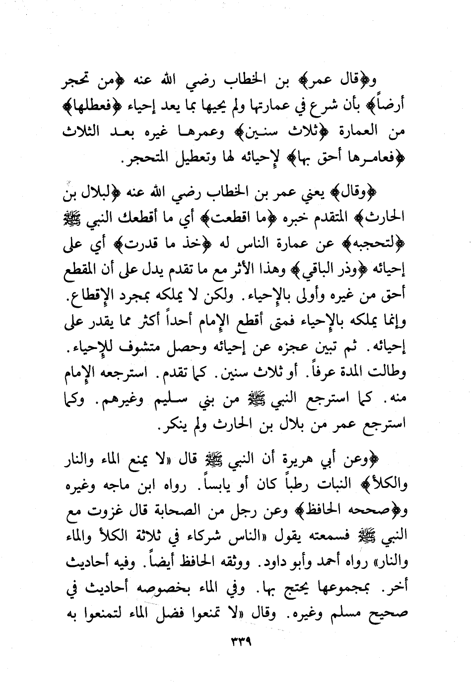 (وقال) يعني عمر بن الخطاب -رضي الله عنه- (لبلال بن الحارث) المتقدم خبره (ما اقطعت) أي ما أقطعك النبي - صلى الله عليه وسلم - (لتحجبه) عن عمارة الناس له (خذ ما قدرت) أي على إحيائه (وذر الباقي) وهذا الأثر مع ما تقدم يدل على أن المقطع أحق من غيره وأولى بالإحياء. ولكن لا يملكه بمجرد الإقطاع. وإنما يملكه بالإحياء فمتى أقطع الإمام أحداً أكثر مما يقدر على إحيائه. ثم تبين عجزه عن إحيائه وحصل متشوف للإحياء. وطالت المدة عرفاً. أو ثلاث سنين. كما تقدم. استرجعه الإمام منه. كما استرجع النبي - صلى الله عليه وسلم - من بني سليم وغيرهم. وكما استرجع عمر من بلال بن الحارث ولم ينكر.