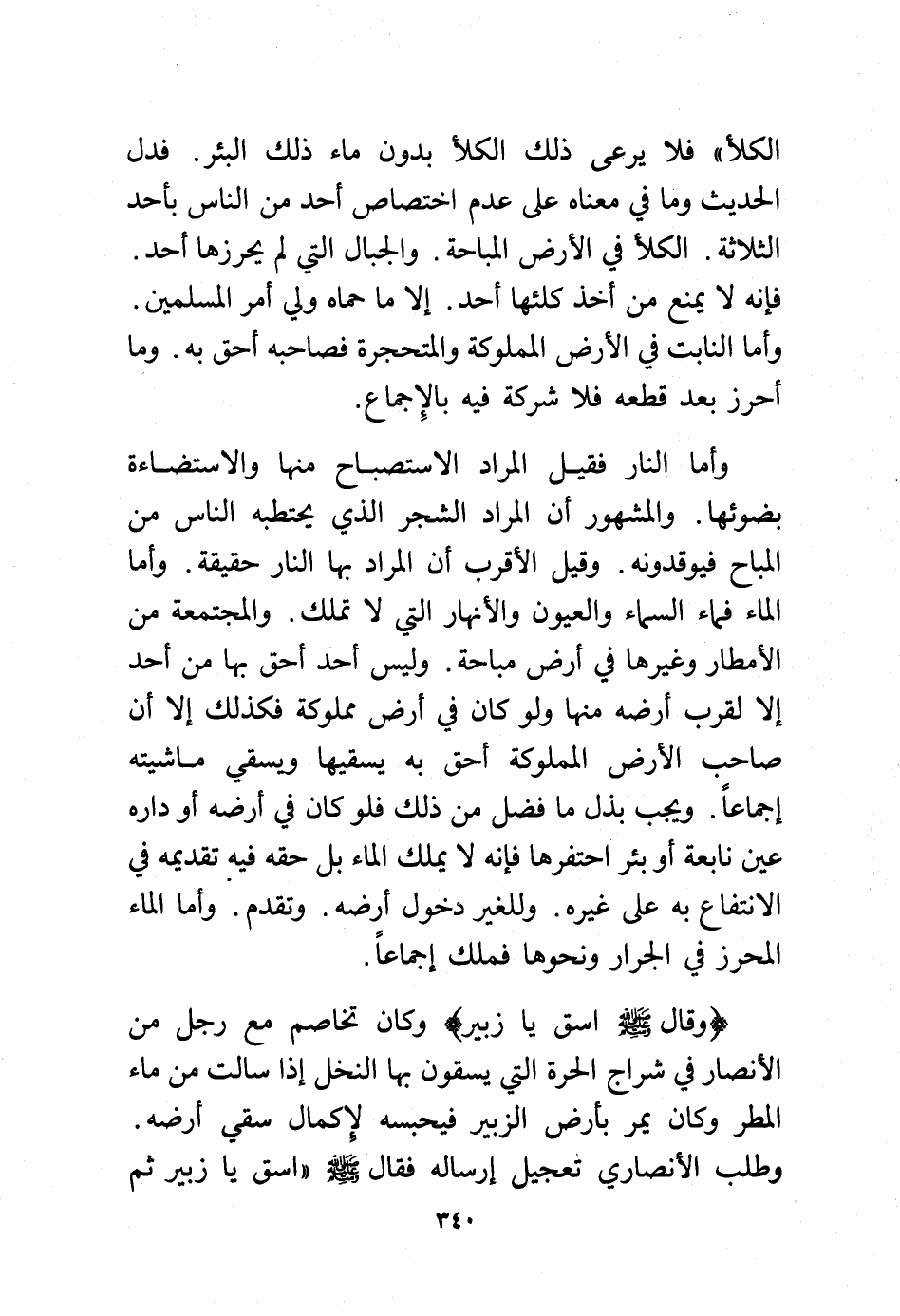 الكلأ" فلا يرعى ذلك الكلأ بدون ماء ذلك البئر. فدل الحديث وما في معناه على عدم اختصاص أحد من الناس بأحد الثلاثة. الكلأ في الأرض المباحة. والجبال التي لم يحرزها أحد. فأنه لا يمنع من أخذ كلئها أحد. إلا ما حماه ولي أمر المسلمين. وأما النابت في الأرض المملوكة والمتحجرة فصاحبه أحق به. وما أحرز بعد قطعه فلا شركة فيه بالإجماع.