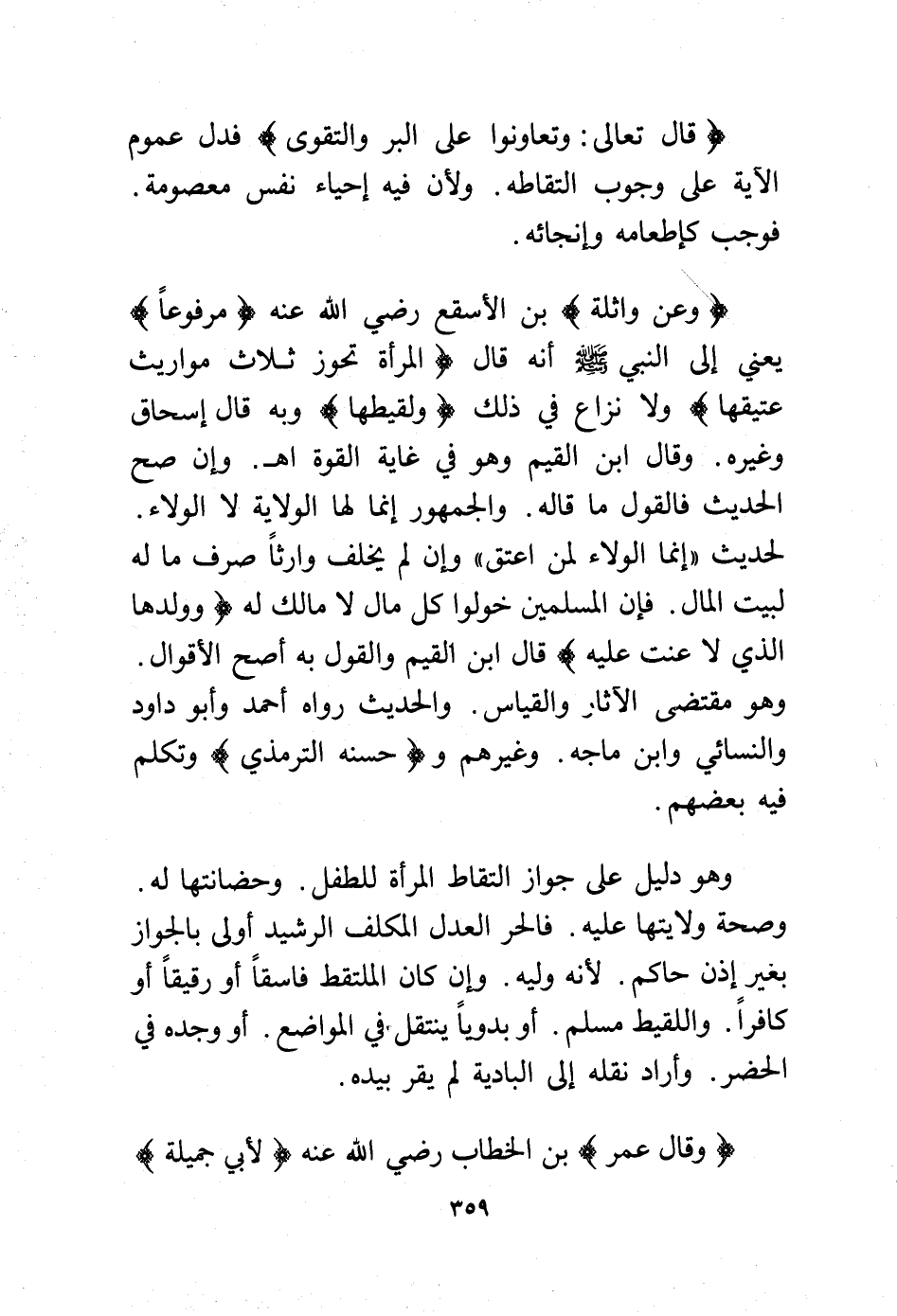(وعن واثلة) ابن الأسقع -رضي الله عنه- (مرفوعًا) يعني إلى النبي - صلى الله عليه وسلم - أنه قال (المرأة تحوز ثلاث مواريث عتيقها) ولا نزاع في ذلك (ولقيطها) وبه قال إسحاق وغيره. وقال ابن القيم وهو في غاية القوة اهـ. وإن صح الحديث فالقول ما قاله. والجمهور إنما لها الولاية لا الولاء. لحديث "إنما الولاء لمن أعتق" وإن لم يخلف وارثًا صرف ماله لبيت المال. فإن المسلمين خولوا كل مال لا مالك له (وولدها الذي لا عنت عليه) قال ابن القيم والقول به أصح الأقوال.